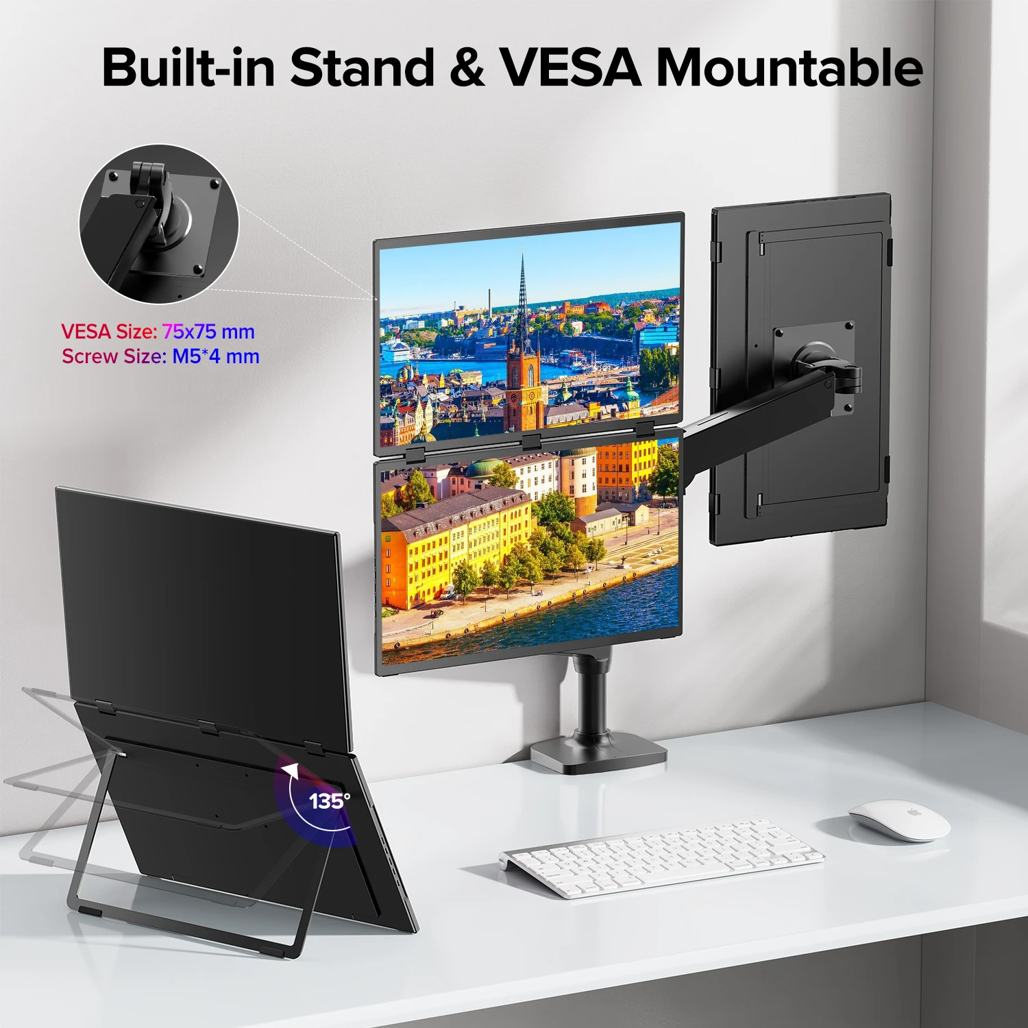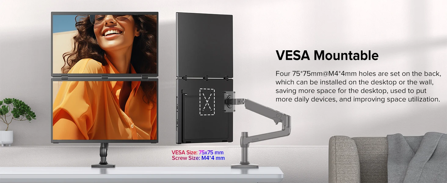 - VESA (75x75mm, M4*4mm) compatible for easy mounting on walls or arms, ideal for saving desk space.