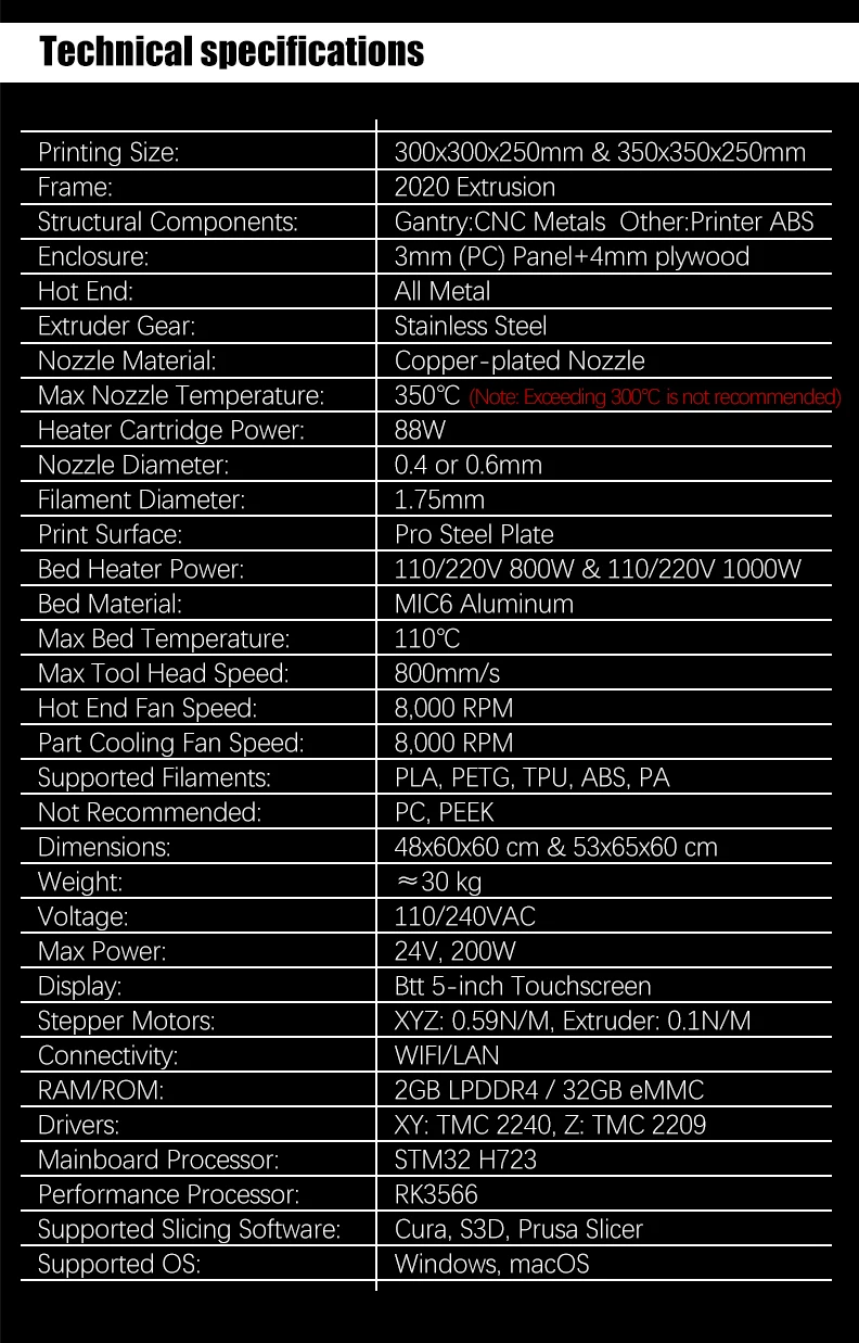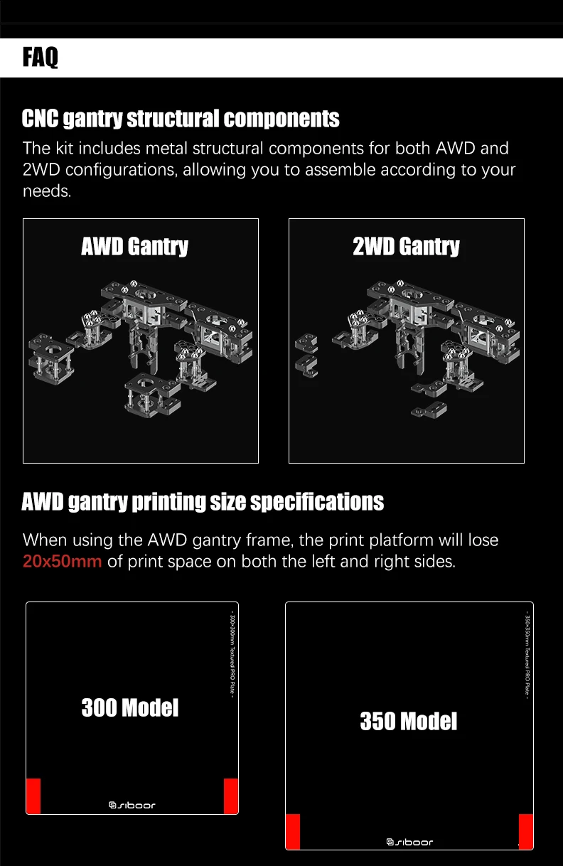 SIBOOR Trident [JUNE, 2024] includes CNC metal structural parts and necessary ABS structural parts, equipped with a gantry, compatible with AWD and 2WD. The printing area of the 300 model is 300×300×250mm, and the printing area of the 350 model is 350×350×250mm (when using AWD, the front side of the printing plate will lose a certain area).