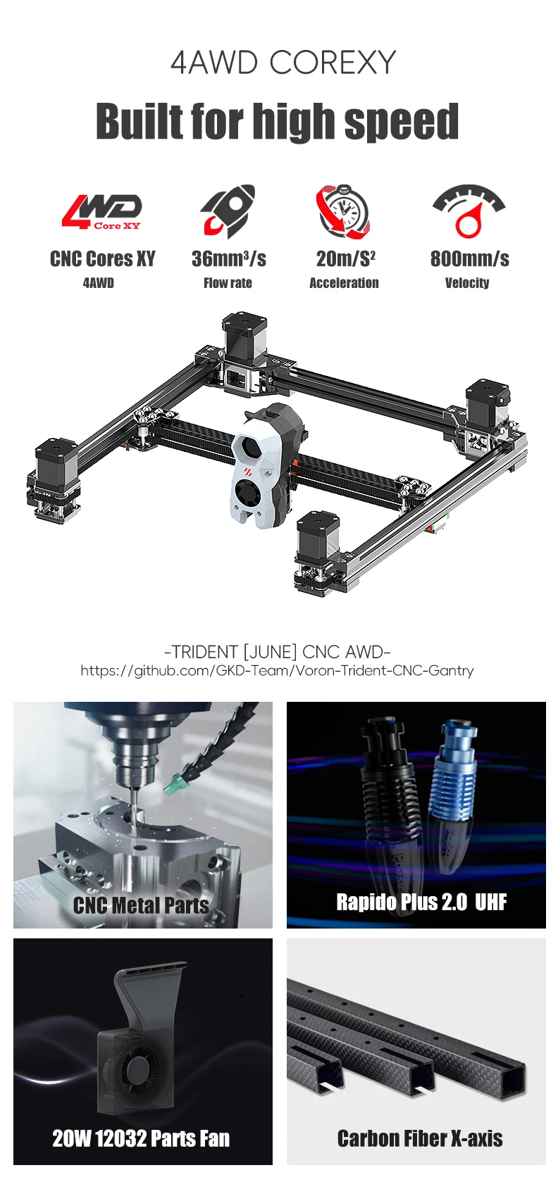 Rapido 2.0 UHF Hotend: Capable of reaching up to 320°C, with a flow rate up to 36 cubic millimeters per second, for high-performance printing.