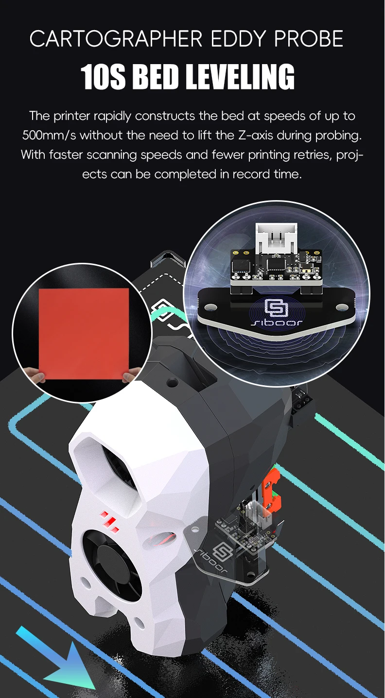 Cartographer Eddy Current Sensor: Generates a bed mesh in just 10 seconds, complemented by a 3Z full gantry leveling system for accurate calibration.