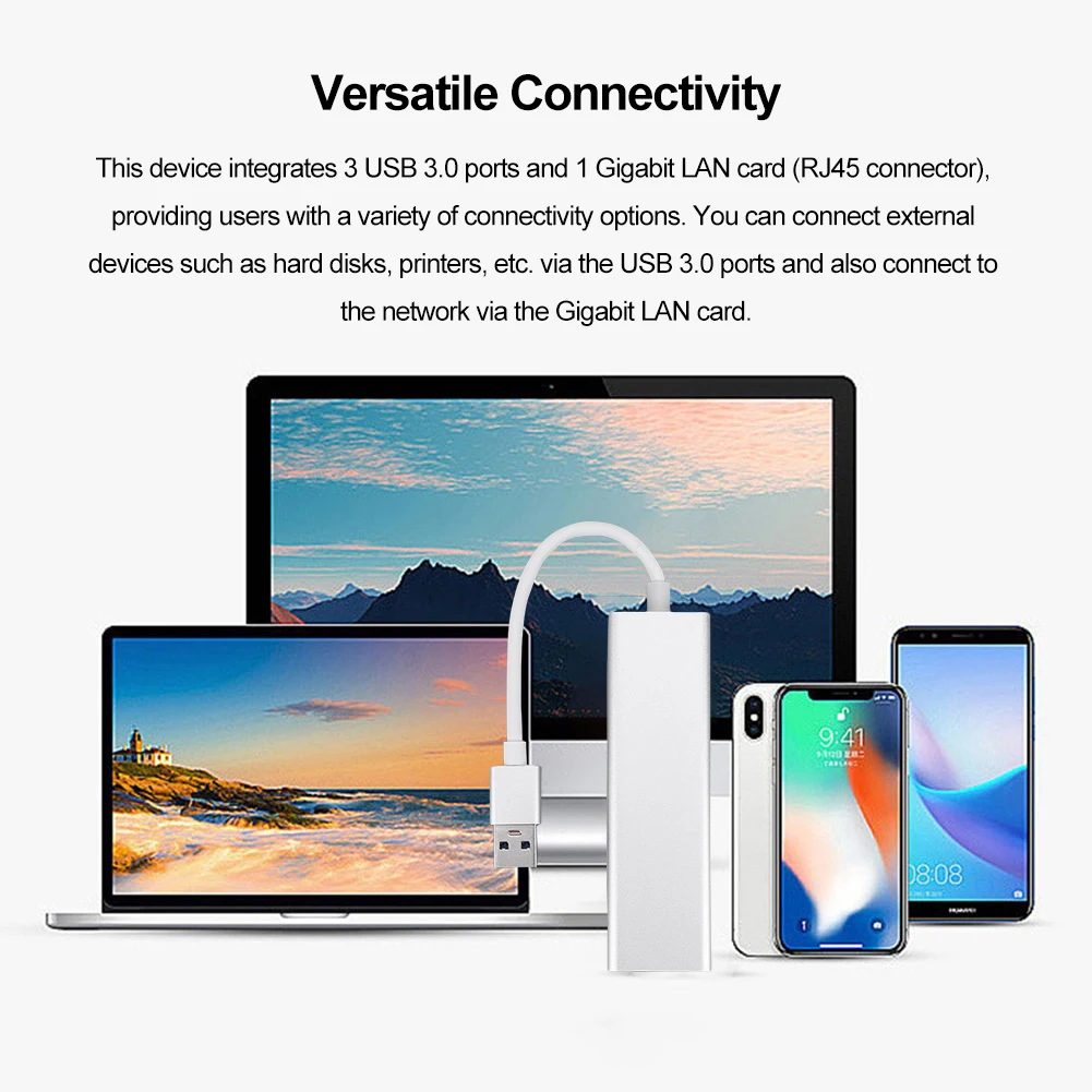 • Versatile Connectivity: This Ethernet USB adapter combines 3 USB 3.0 ports and 1 Gigabit Ethernet port (RJ45) to provide users with multiple connection options. You can connect external devices such as hard drives, printers, and more via the USB 3.0 ports, while also enjoying a high-speed network connection through the Gigabit Ethernet port.