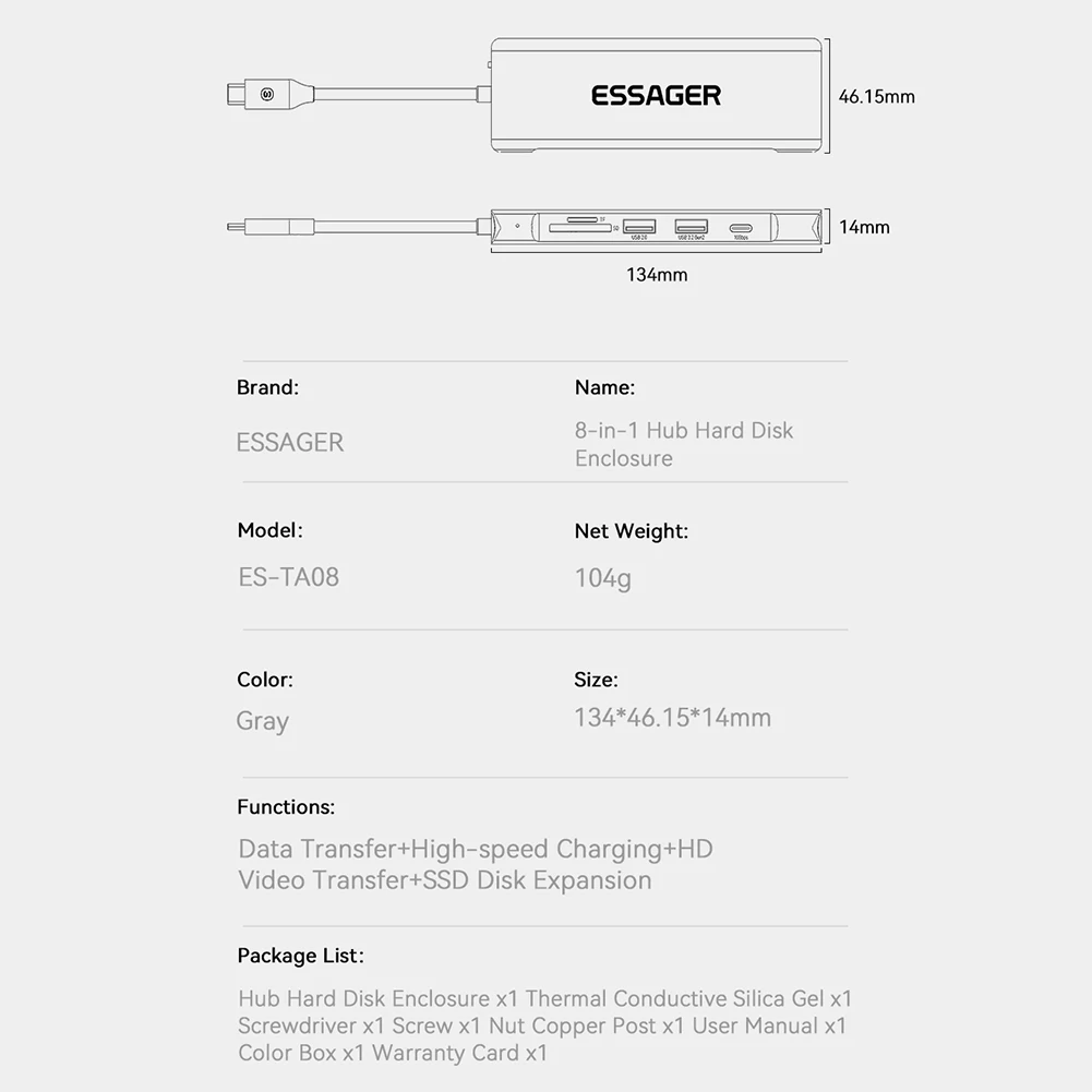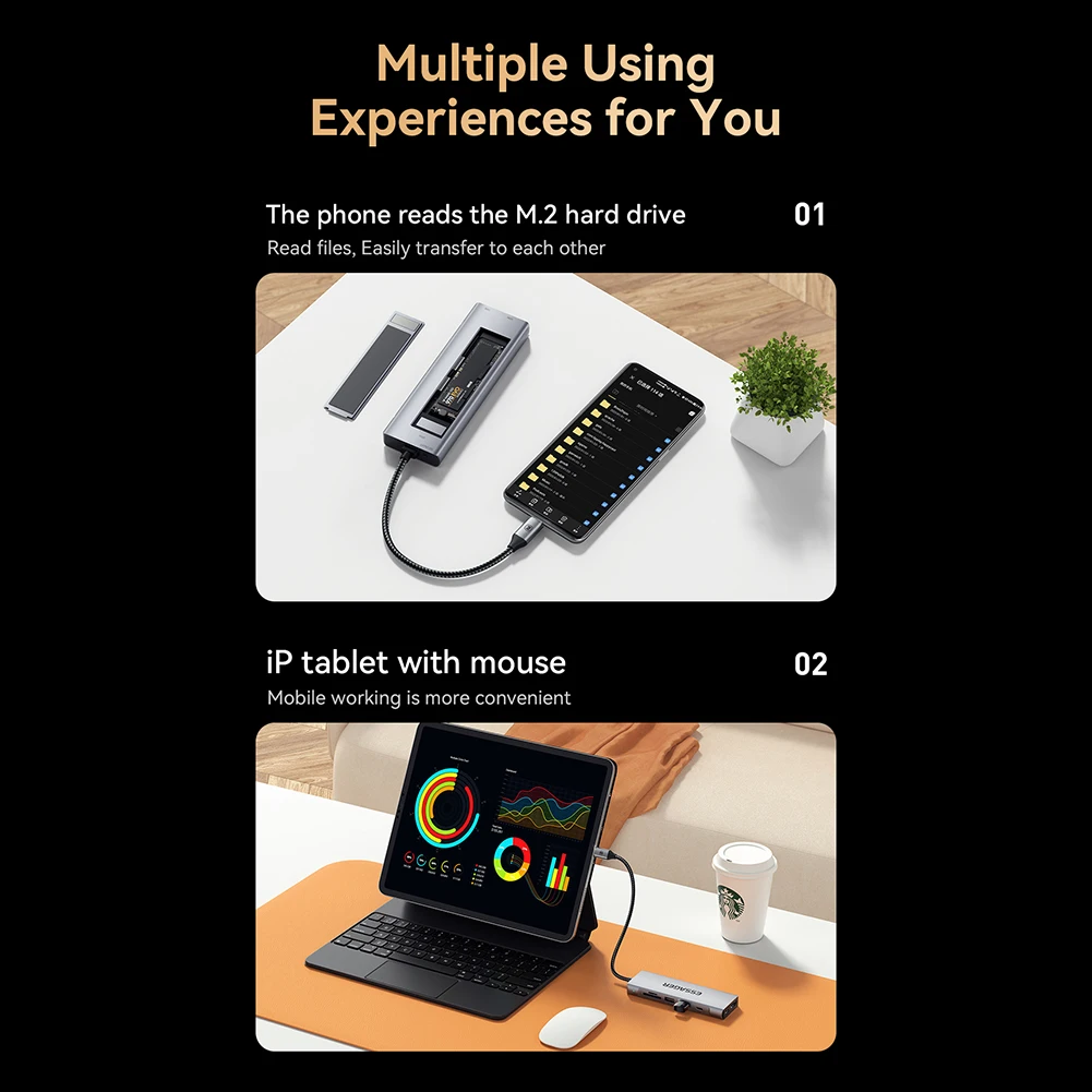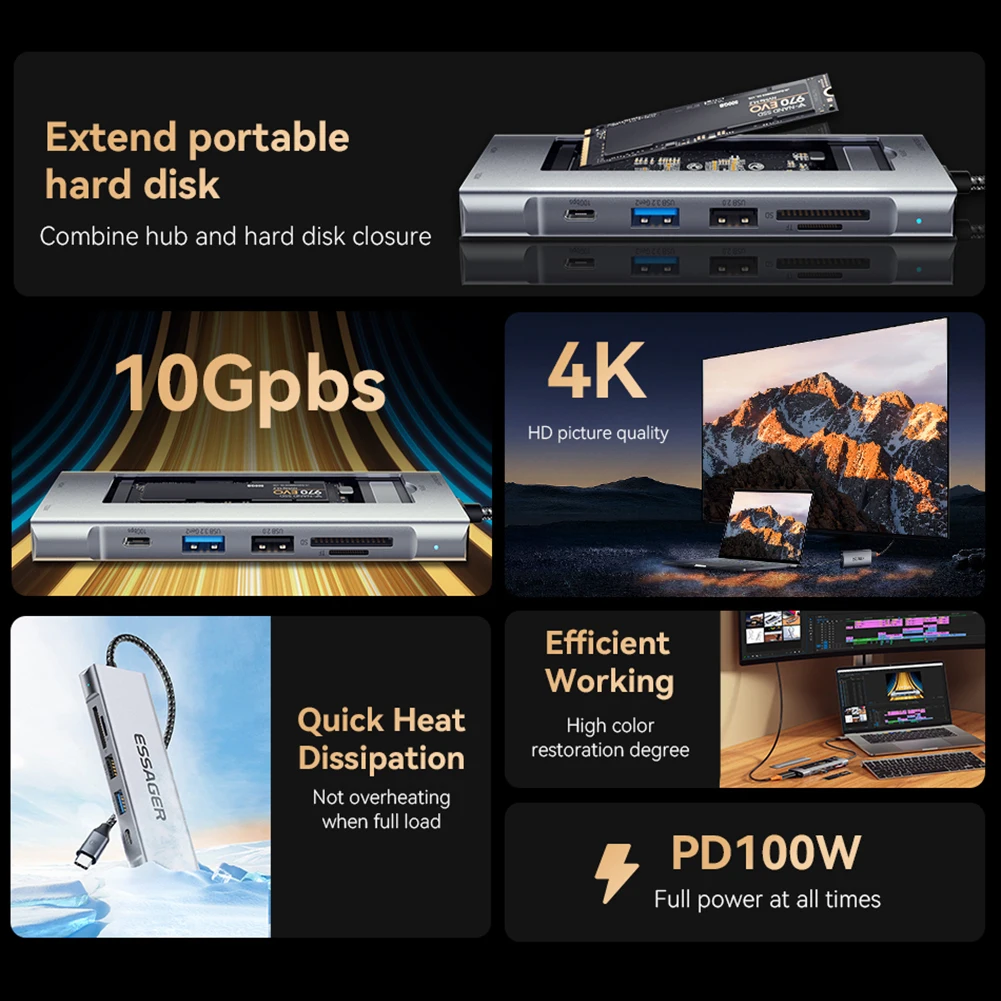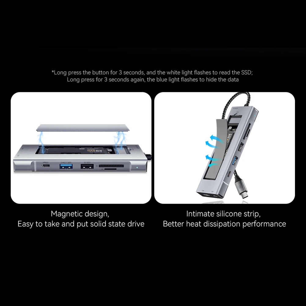 - Docking Station and Hard Disk Box 2-in-1: Combines a docking station and a hard disk enclosure in one. Offers 4K high-definition output, switch design, and one-button concealment for the hard disk.