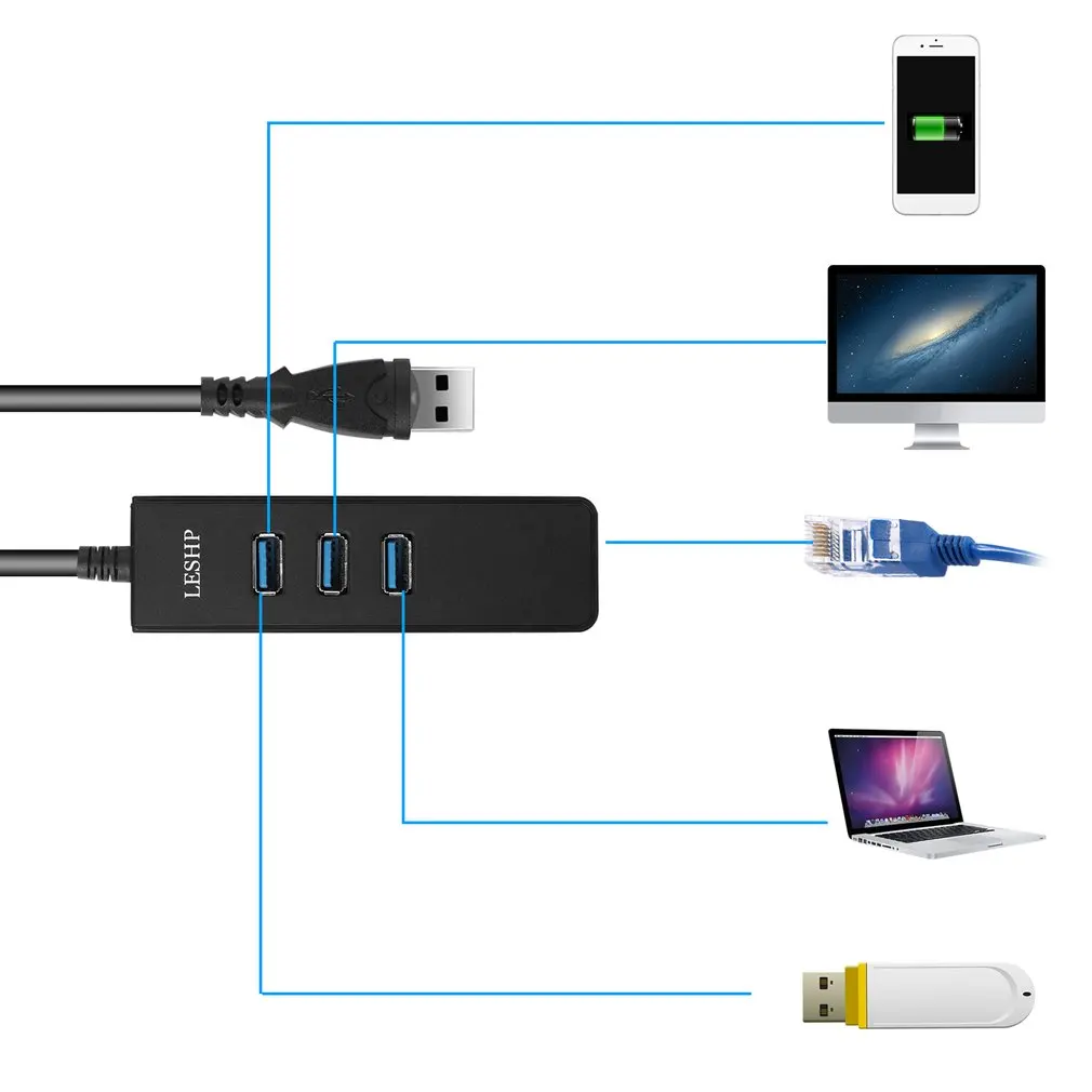 - LESHP 3-Port USB 3.0 Portable Data Hub and Ethernet Network Adapter, USB 3.0 cable.