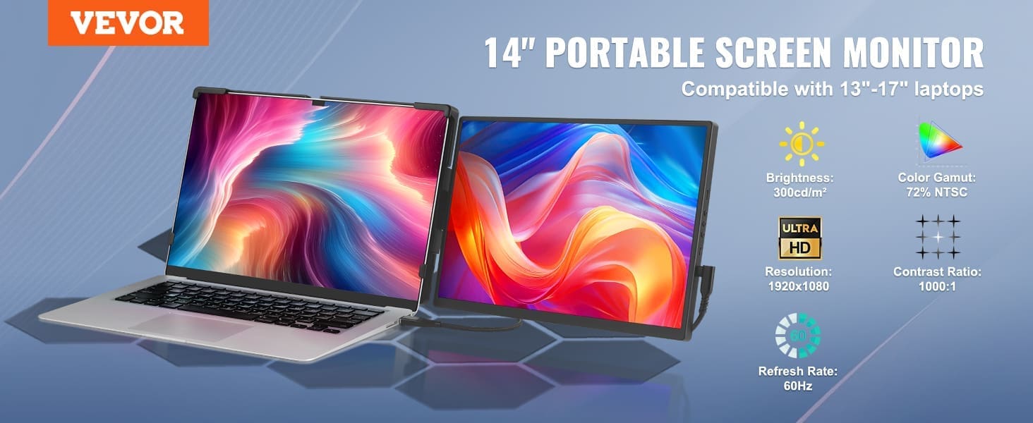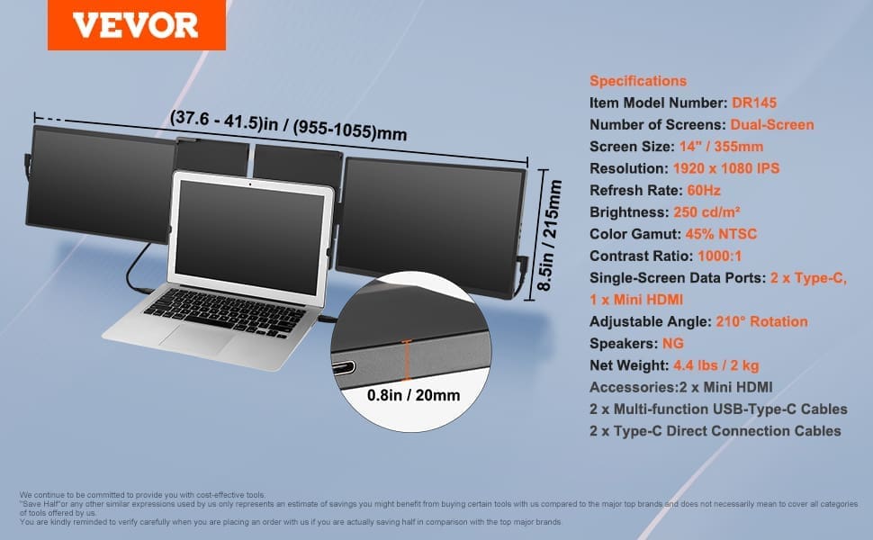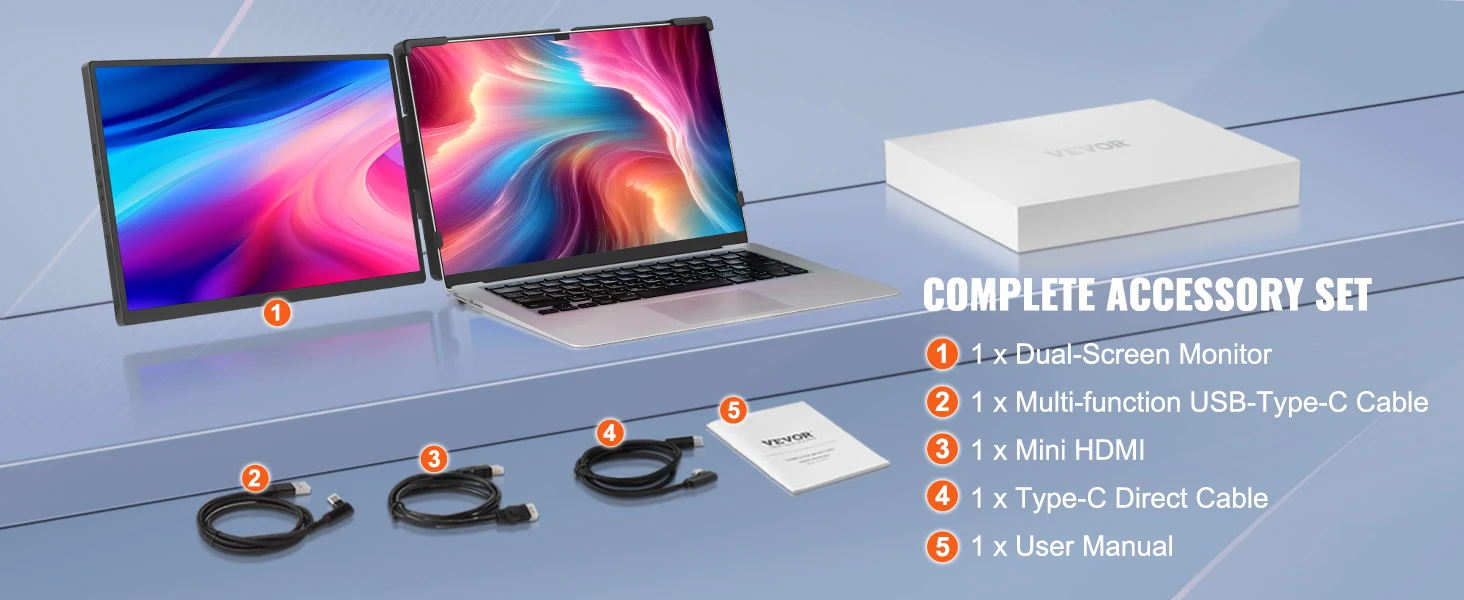 Includes all necessary accessories: 1 mini HDMI cable, 1 multifunctional USB Type-C cable, and 1 Type-C direct connection cable. Weighing just 2.6 lbs, the VEVOR monitor for the laptop screen ensures efficient work anywhere.