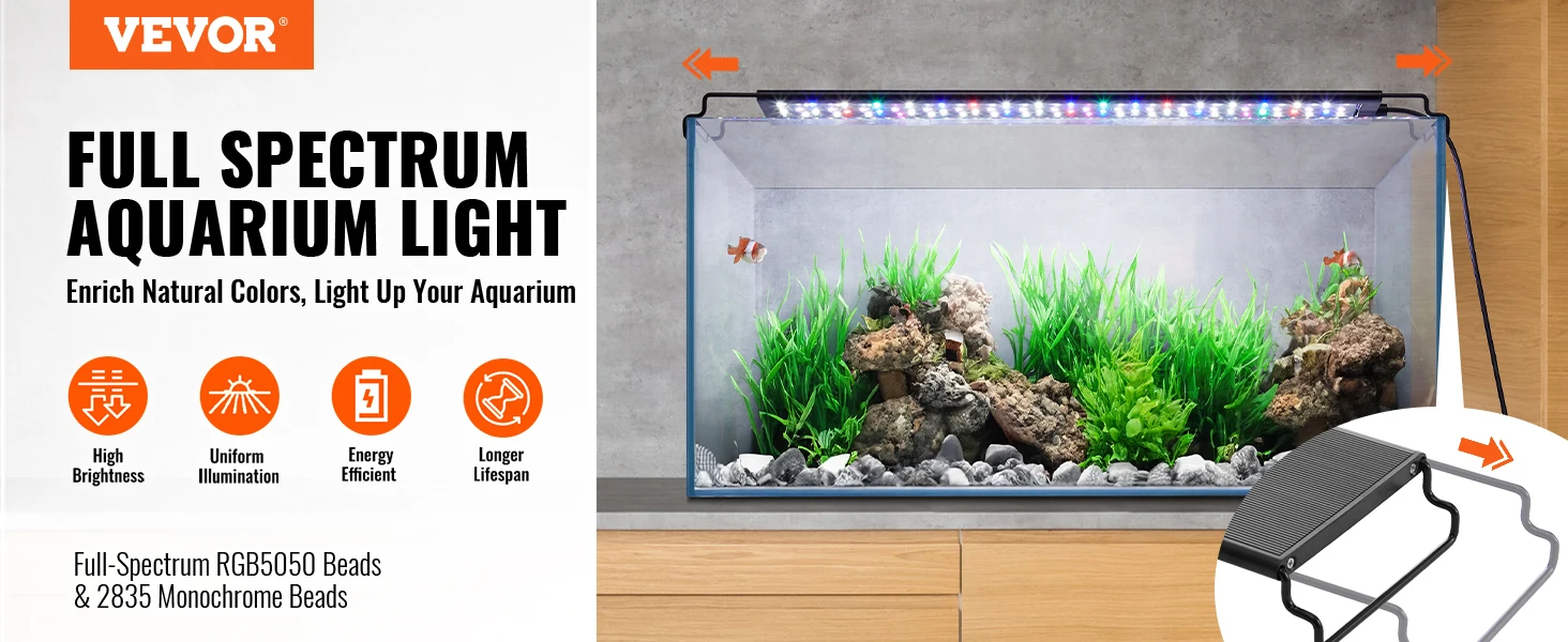 - Upgraded High-Quality LED Lights: VEVOR full-spectrum aquarium lights include high-power RGB5050 and 2835 monochrome beads, delivering stable, uniform lighting without flickering. These energy-efficient lights offer optimal fish visibility and can last up to 30,000 hours.