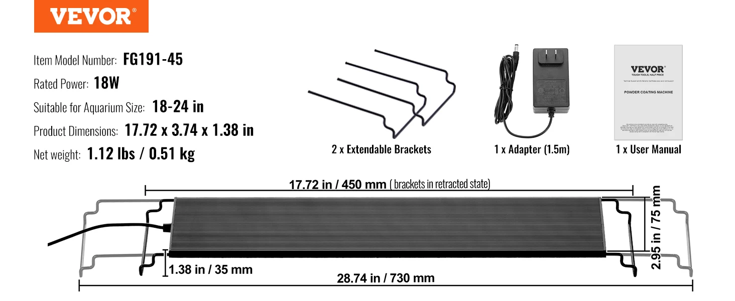 - Wide Applications: Designed for 18-24 inch aquariums, the LED light features two extendable brackets, each extending up to 5.5 inches per side (11 inches total). It easily fits most glass or acrylic tanks, with or without hoods and rims—perfect for beginners and experienced aquarists alike.