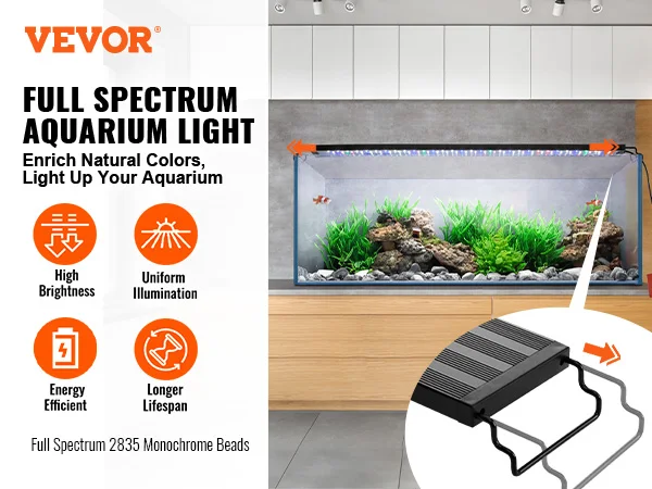 - Upgraded High-Quality LED Lights: VEVOR full-spectrum 5-row LED aquarium lights feature high-quality 2835 monochrome beads that provide uniform, stable lighting without flicker. The full spectrum enhances your fish’s visual appeal while supporting long-lasting, energy-saving performance—up to 30,000 hours.