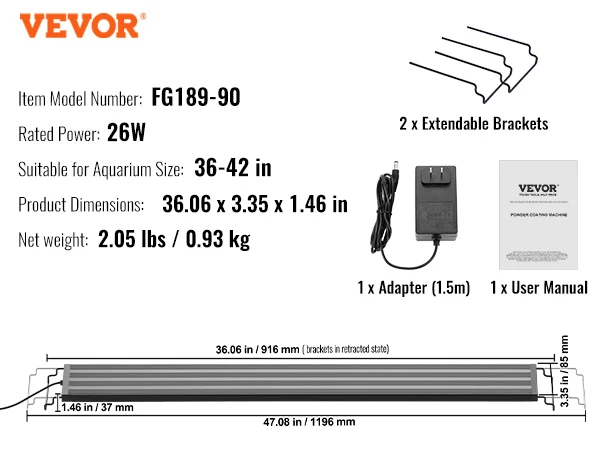 - Wide Applications: Designed for 36–42 inch aquariums, VEVOR aquarium LED lights come with two extendable brackets. Each side extends up to 5.5 inches (11 inches total), making it easy to fit most glass or acrylic tanks—rimmed or rimless, with or without a hood. Perfect for both beginner and experienced aquarists.
