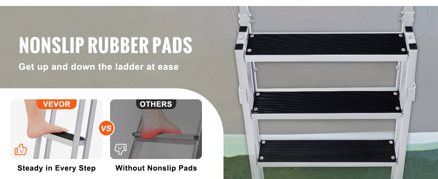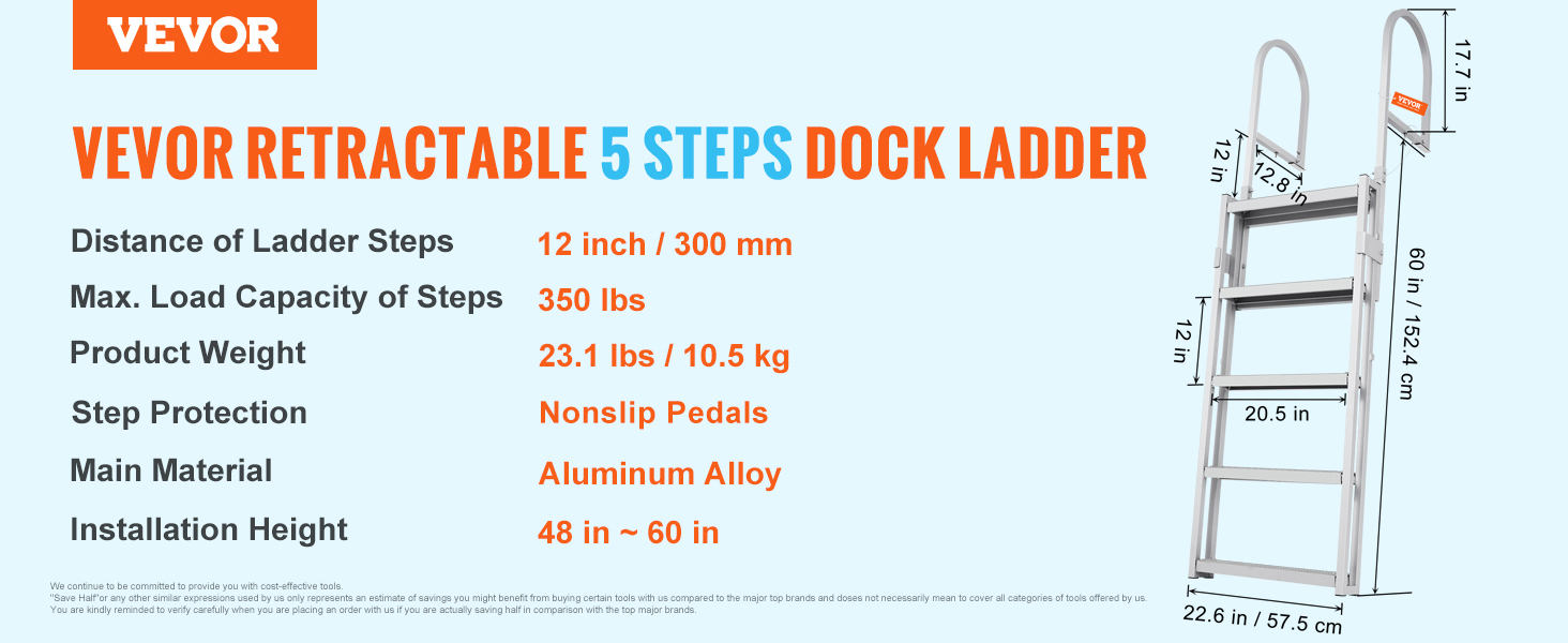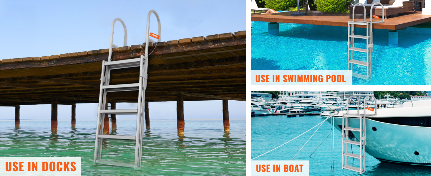 Thanks to its flexible design, this VEVOR retractable dock ladder can satisfy different water depth positions. It is made of an aluminum alloy frame, ensuring security and stability. The 4-inch widened pedals include non-slip rubber pads, offering a strong 350 lbs load capacity and increased friction.