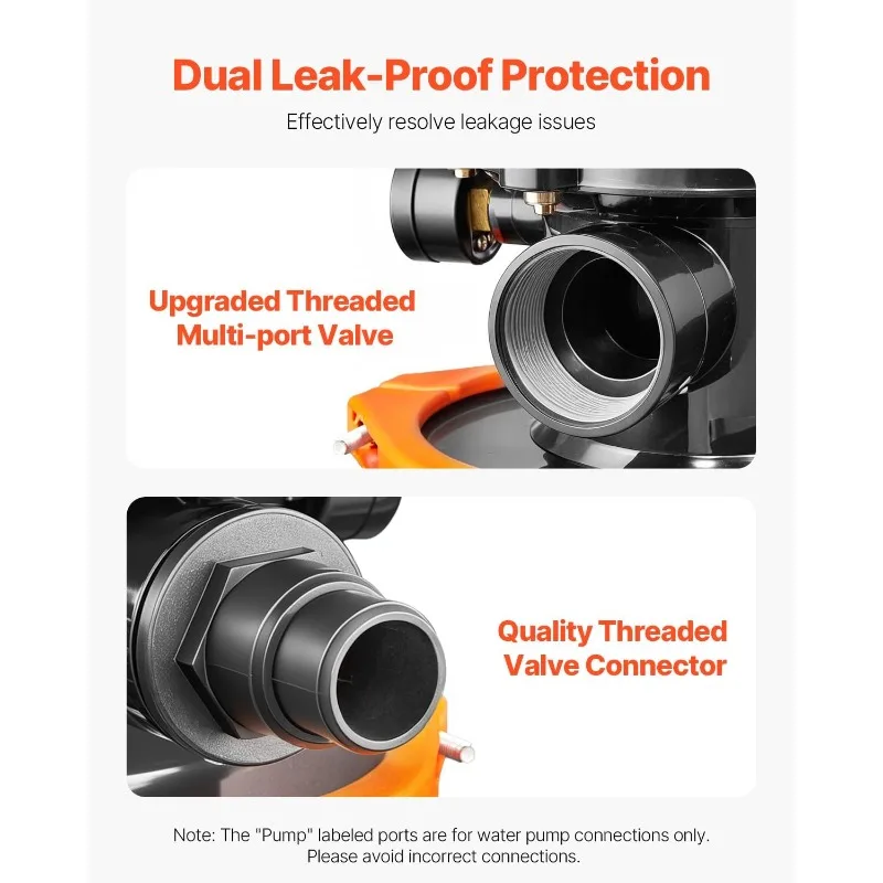 - Double Leak-Proof Protection: Built with a threaded multi-port valve and durable threaded connections, this sand filter pump tackles common leaks head-on, ensuring a secure, leak-free experience. Plus, it’s equipped with an Intex connector for easy setup with Intex pools. Ideal for both home and commercial pools, including backyard pools, community pools, and even small water parks.