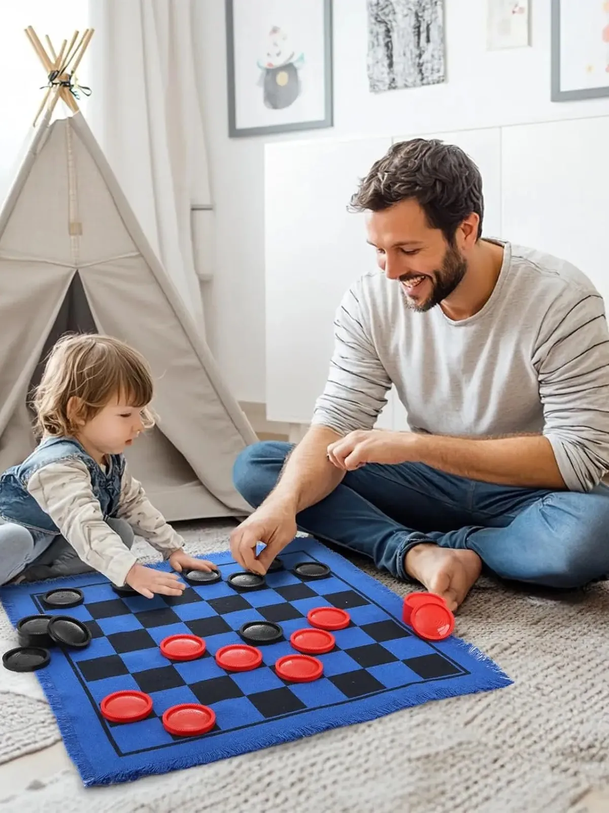 Bring classic game night vibes home with this 3-in-1 vintage giant checkers mat game set in blue. The reversible play mat lets you switch between games in seconds, making it a fun pick for kids, teens, and adults.