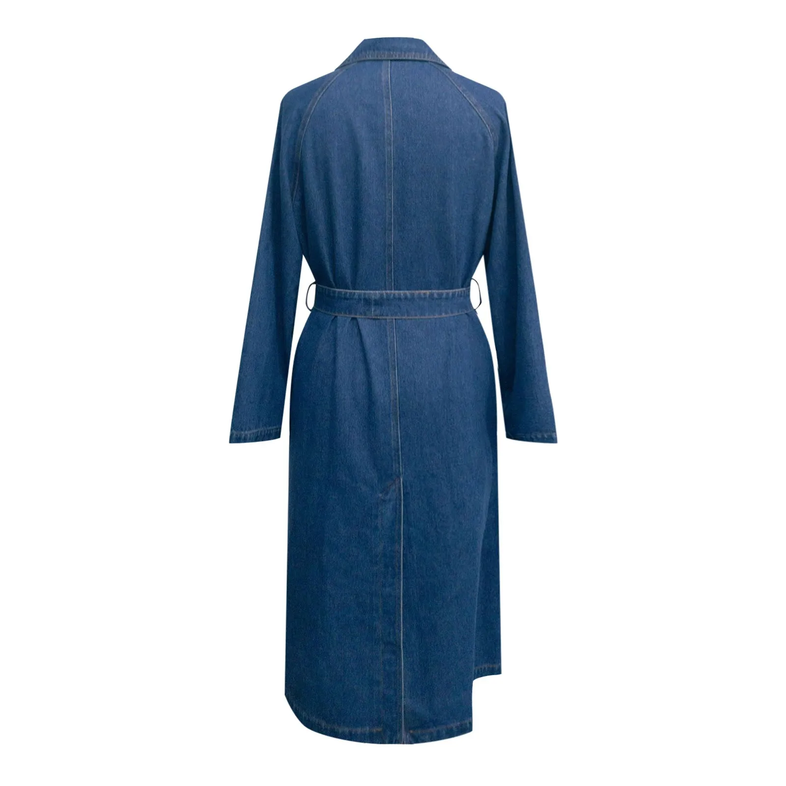 Design & Style: Vintage long denim jacket for women. It features a front double-breasted button-up closure, a classic notch lapel, and two slanted side entry pockets for your hands. The jacket extends below the knee.