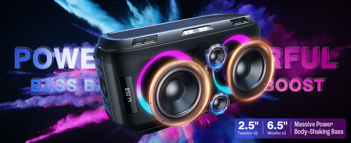 250W Peak Extra Mega Bass: Unleash the audio powerhouse armed with 2 extra-large 6.5” woofers and 2 crystal-clear 2.5” tweeters, delivering an explosive sonic experience. Indoors or outdoors, revel in the super bass, pure mid-range, and crisp treble. The W-KING DSP advanced chip elevates the music, mastering all music genres for an exhilarating musical journey. With 250W peak high power, this is your ticket to a customized private concert hall, offering concert-level music ecstasy anytime, anywhere.