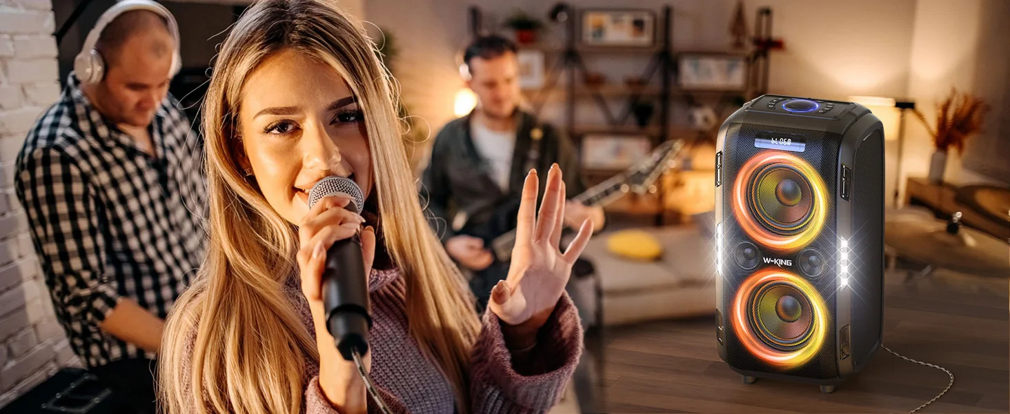 Mic & Guitar Port: T9 PRO goes beyond music playback, supporting dynamic microphones, guitars, and other instruments with 6.35mm jacks. Also perfect for wireless mics with 6.35mm output receivers (not included), it facilitates speeches, parties, karaoke, and guitar performances at events. Experience ultra-clear mic and high-fidelity audio, enhanced with built-in echo reverb effects, giving you the edge of a professional singer. (In MIC mode with the guitar function, press the ECHO to adjust to 0)