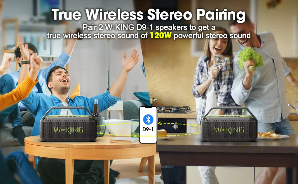 120W PAIRING POWERFUL STEREO & BLUETOOTH 5.0: Pair two D9-1 portable wireless Bluetooth speakers to instantly achieve 120W super stereo surround sound. Whether you’re at a party, watching a movie, or outdoors, the D9-1 loud Bluetooth speaker delivers a powerful sound shock and an unprecedented listening experience. Bluetooth 5.0 ensures a stable connection up to 100ft, so you won’t miss a happy moment while playing music or making a hands-free call. (Note: D9 and D9-1 cannot be paired.)
