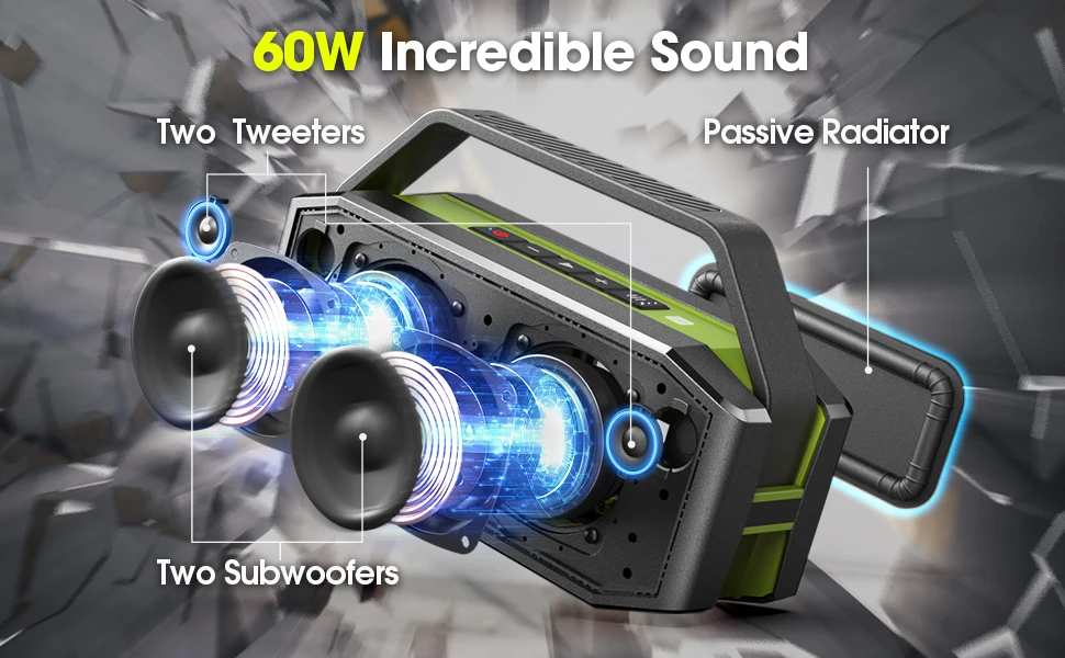IPX6 WATERPROOF & EQ: The D9-1 outdoor waterproof Bluetooth speaker is a rugged and IPX6 waterproof Bluetooth speaker, allowing you to carry, sing, and party in the rain! The 60W outdoor Bluetooth speaker is an excellent solution for your outdoor activities. Grab your D9-1 portable Bluetooth speaker, play your favorite music, and enjoy the outdoors with your family and friends! Just one-click the EQ button to switch to your favorite audio and enjoy rich, powerful bass, clear mids, or crisp treble.