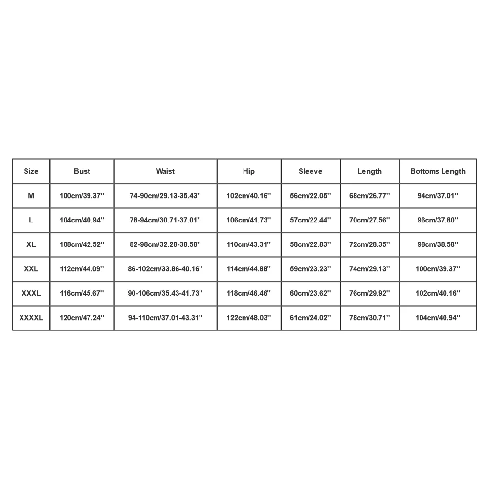 - XXXXL: Bust: 120cm/47.24”, Waist: 94-110cm/37.01-43.31”, Hip: 122cm/48.03”, Sleeve: 61cm/24.02”, Length: 78cm/30.71”, Bottoms Length: 104cm/40.94”