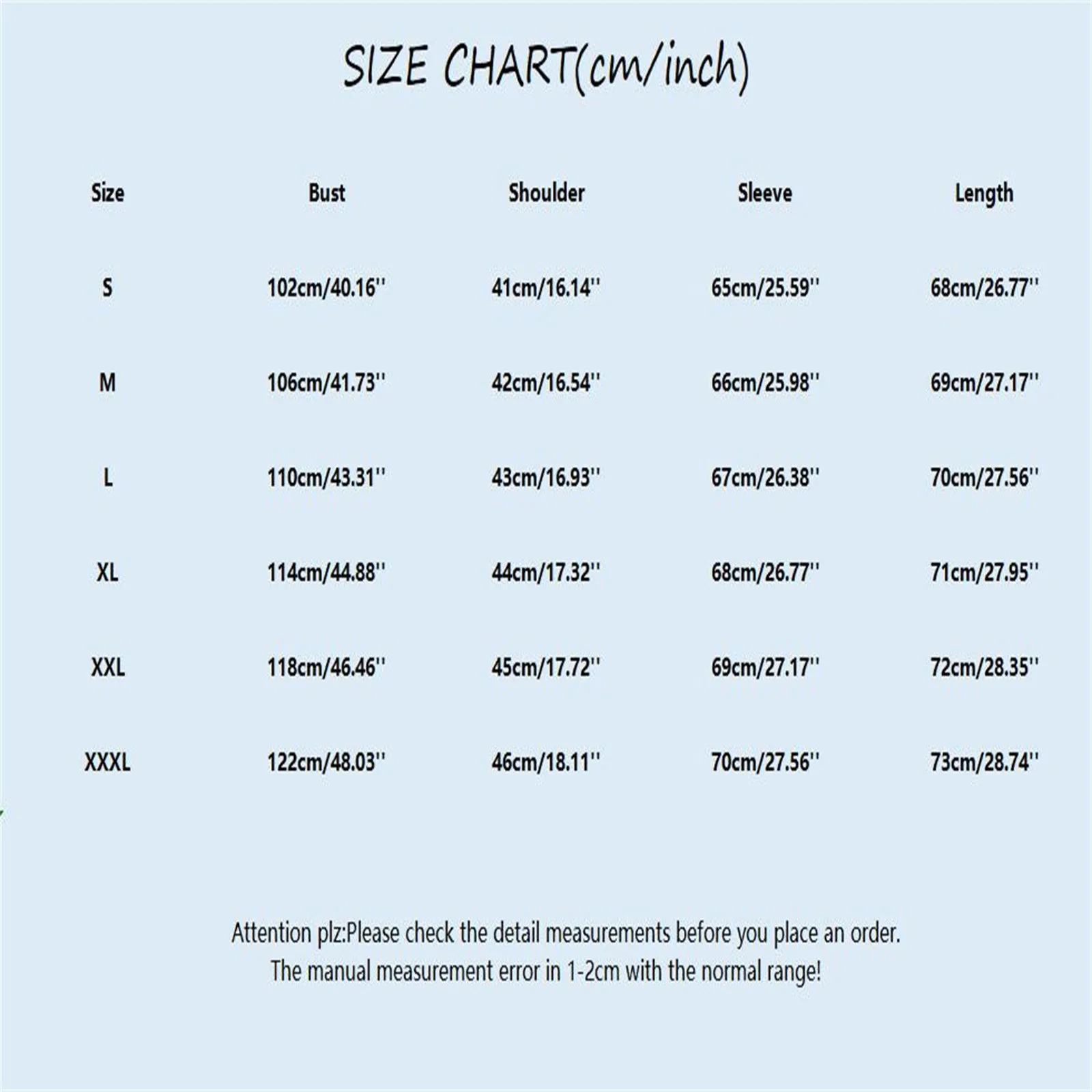 - Size XXXL: Bust: 122cm/48.03”, Shoulder: 46cm/18.11”, Sleeve: 70cm/27.56”, Length: 73cm/28.74”
