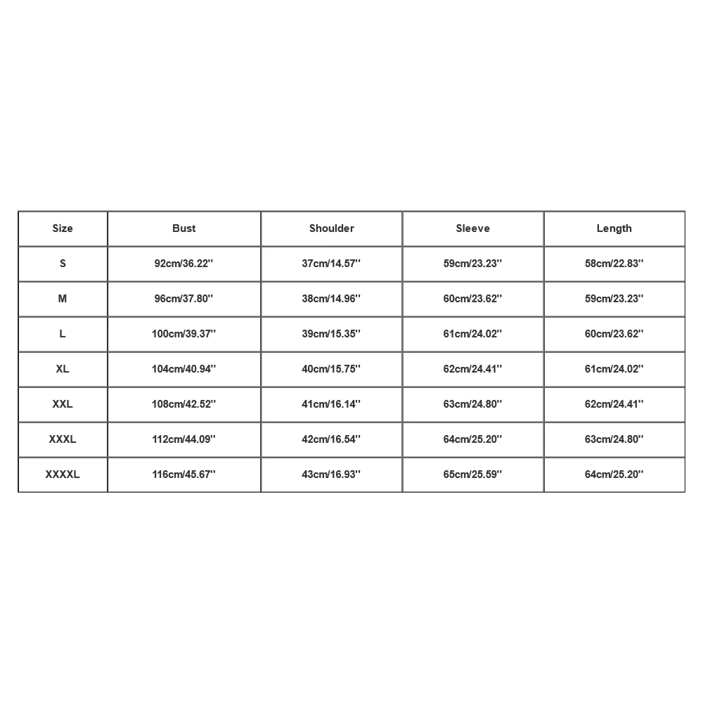 - XXXL – Bust: 112cm (44.09”), Shoulder: 42cm (16.54”), Sleeve: 64cm (25.20”), Length: 63cm (24.80”)