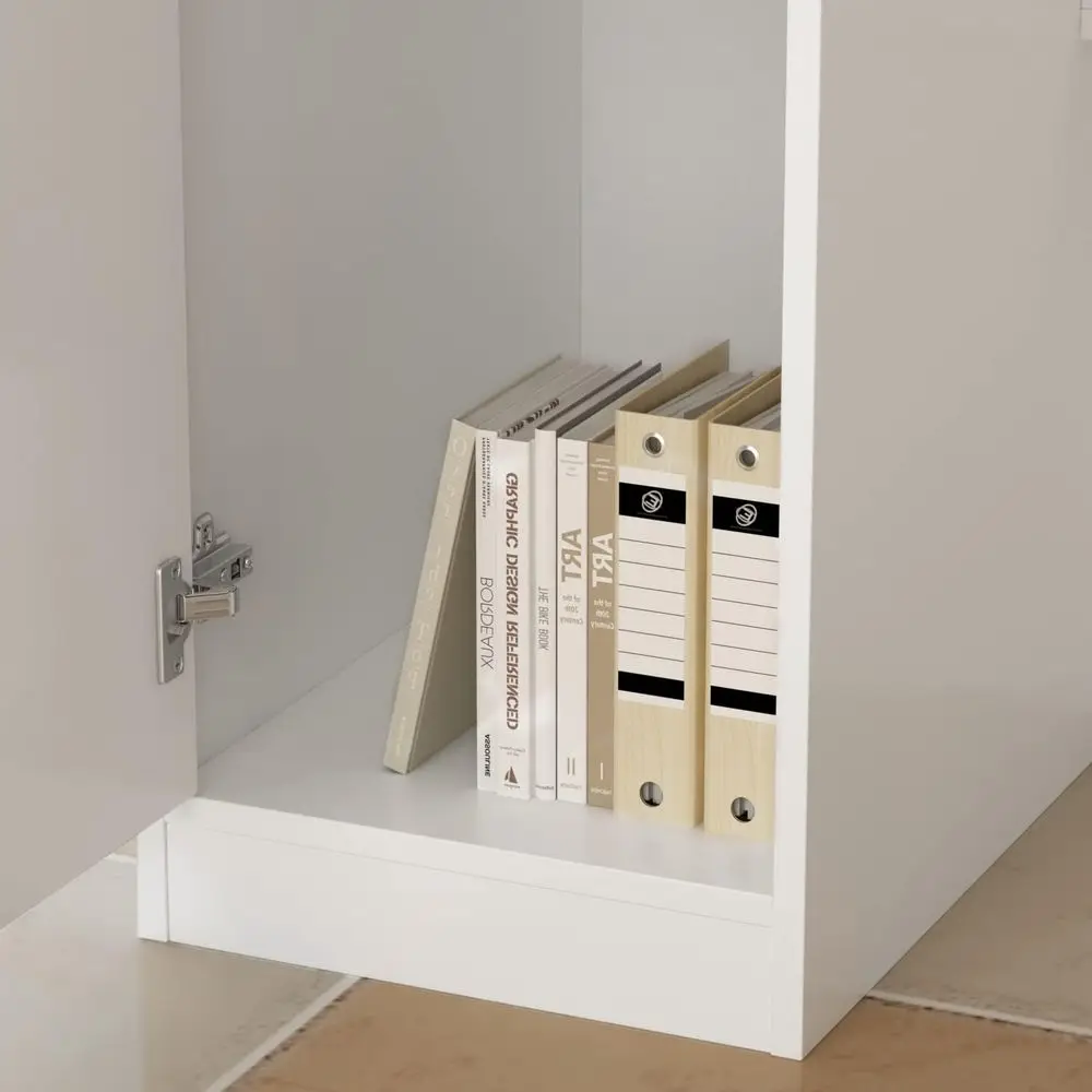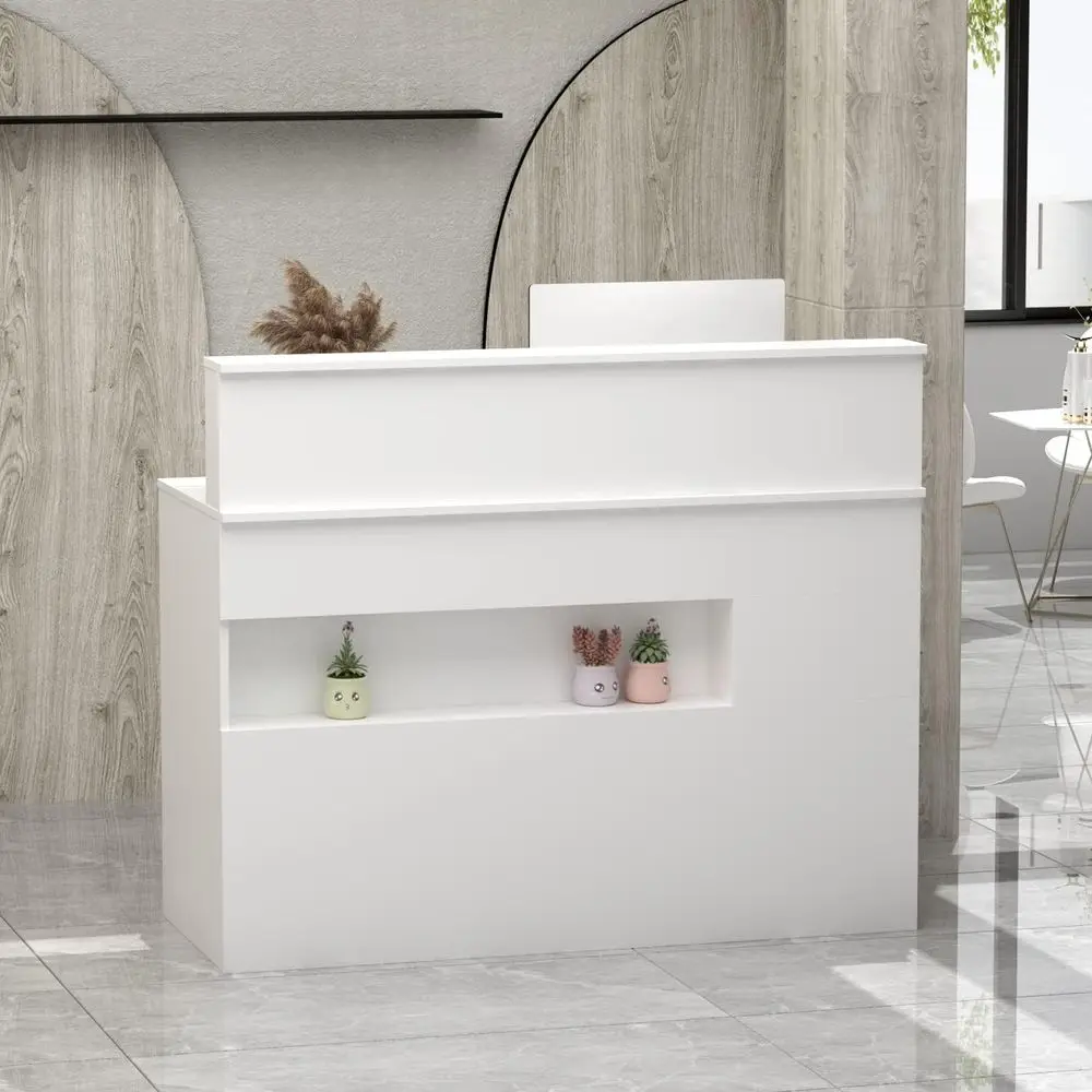 Reception Desk with Light: This reception counter features a modern design with white panels and decorative handles for an elegant look. The open shelf with lighting is suitable for displaying plants or decorative items. It works well in office reception rooms, shops, homes, and schools.