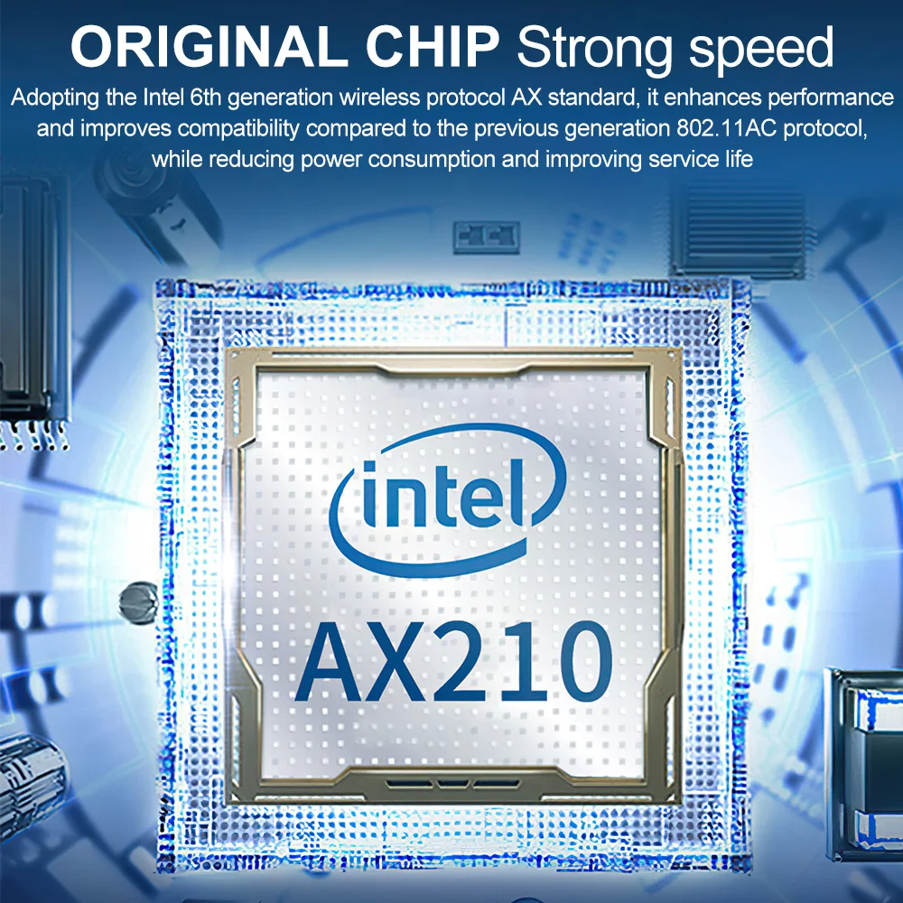 The Wi-Fi 6E AX210 wireless card adapter is designed to support Wi-Fi 6E technology. It supports dual-stream Wi-Fi in the 2.4GHz, 5GHz, and 6GHz bands, as well as Bluetooth 5.3. It also supports Wi-Fi 6 R2 features for greater network flexibility, faster downloads, sharing, and backups, including UL MU-MIMO. These new features maximize the benefits of Wi-Fi 6E, which include gigabit speeds, ultra-low latency, and enhanced reliability benefits of new radio frequencies that are unique to Wi-Fi 6E devices.
