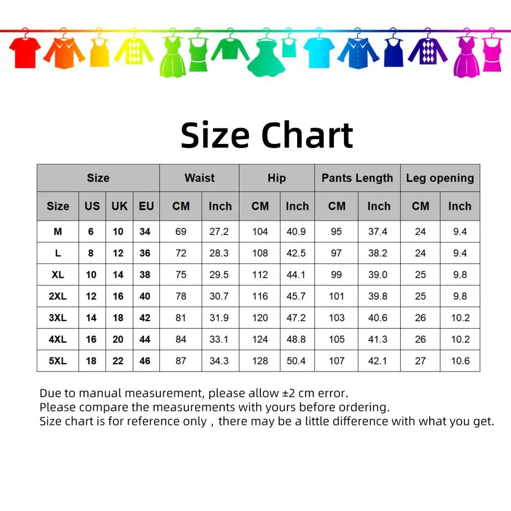 - Size 3XL: Length 103cm/40.6″, Hip 120cm/47.2″, Waist 81cm/31.9″, Leg Opening 13cm/5.1″ (Approx.)