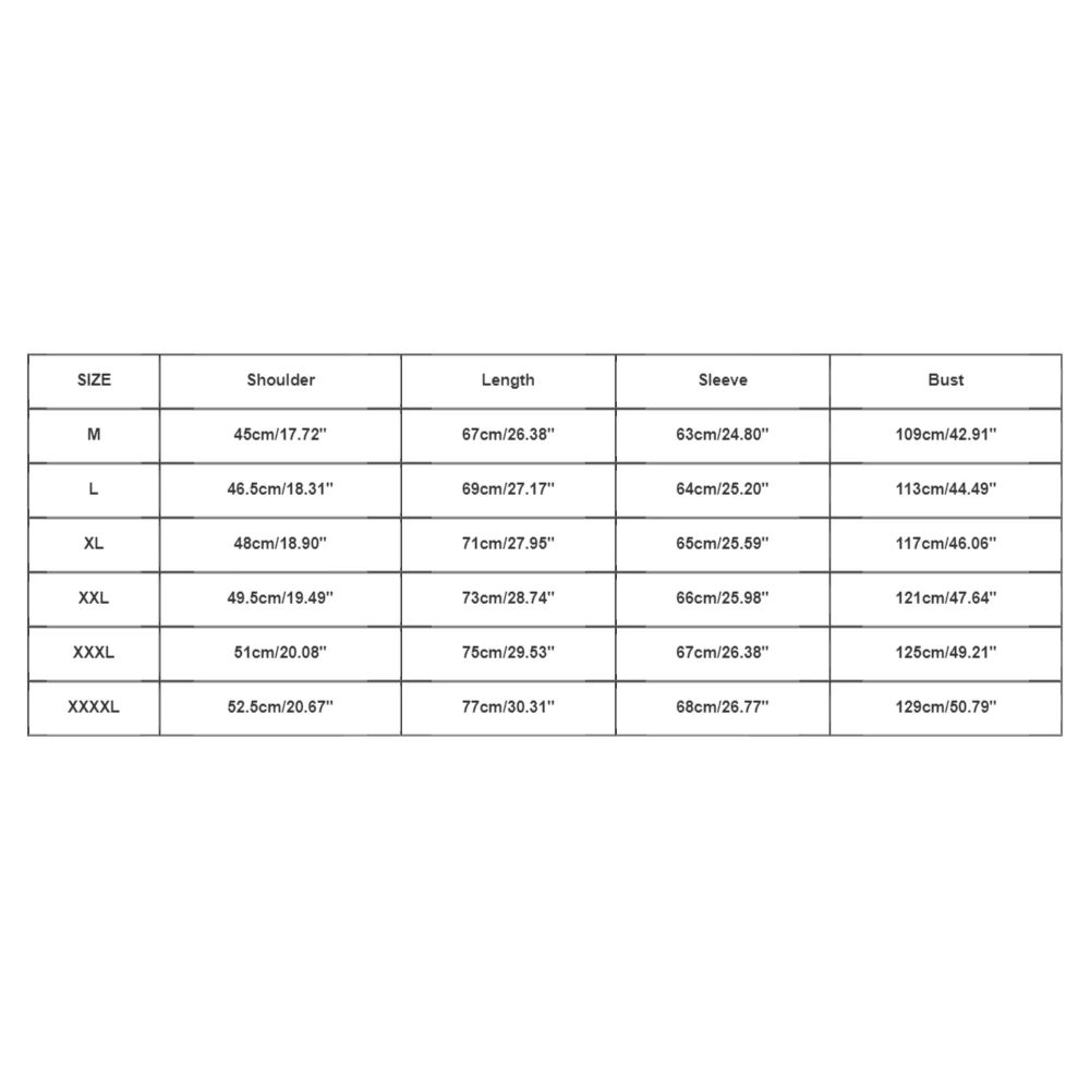 XXXL: Shoulder: 51cm (20.08”), Length: 75cm (29.53”), Sleeve: 67cm (26.38”), Bust: 125cm (49.21”)