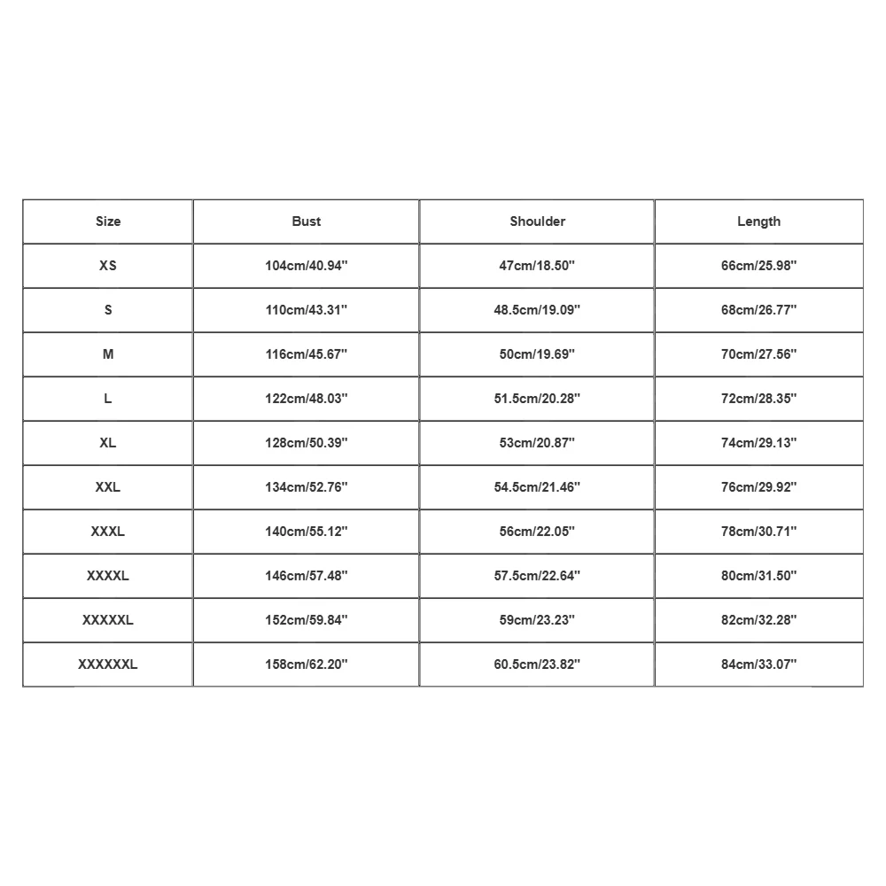 XXXXXL – Bust: 152cm (59.84″), Shoulder: 59cm (23.23″), Length: 82cm (32.28″)