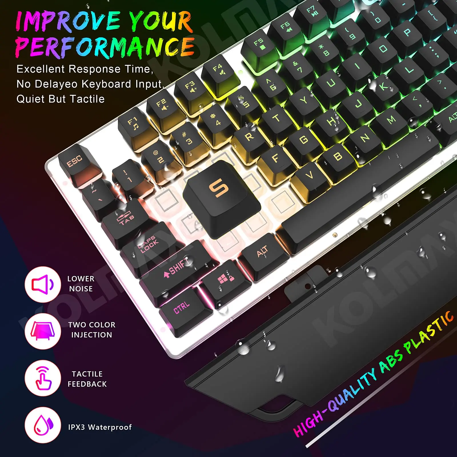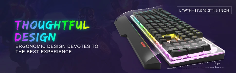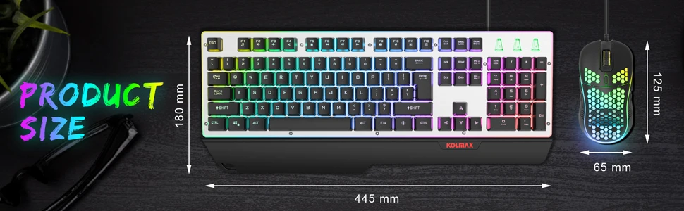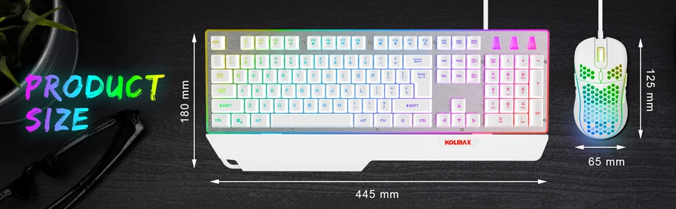 - Lighting: Rainbow backlight; press the LED key to switch modes.