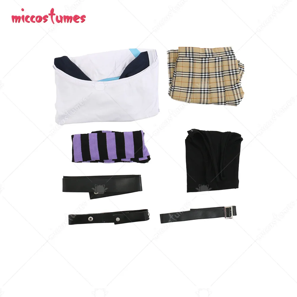 The costume includes a T-shirt, bra, skirt, socks, and belts.