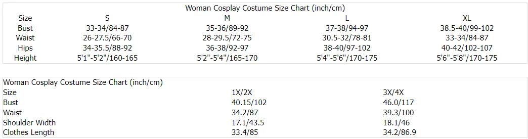 Woman Cosplay Costume Size Chart (inch/cm)