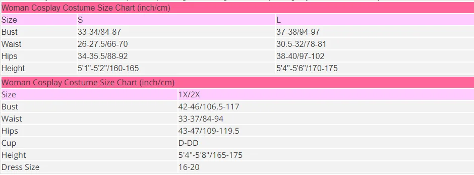 Woman Cosplay Costume Size Chart (inch/cm)