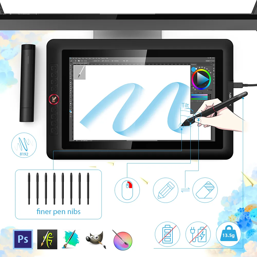 The XPPen Artist 15.6 Pro supports 60 degrees of tilt function to ensure accurate imitation of a real tilting brush effect, delivering smoother and more natural transitions between lines and strokes.