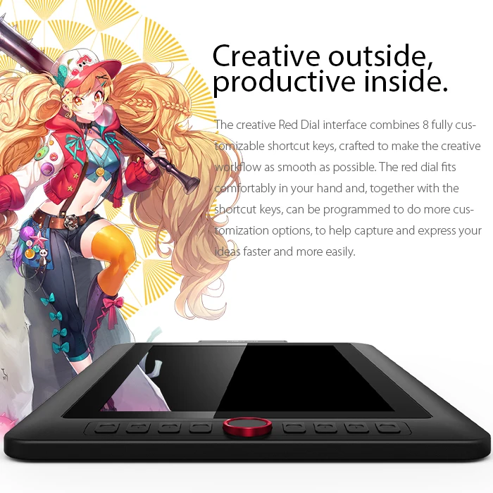 The creative Red Dial interface combines 8 fully customizable shortcut keys, crafted to make your creative workflow as smooth as possible. The red dial fits comfortably in your hand and, together with the shortcut keys, can be programmed for more customization options. Even when switching between software, there’s no need to reset the functions of the shortcut keys and the dial, helping you capture and express your ideas faster and more easily.