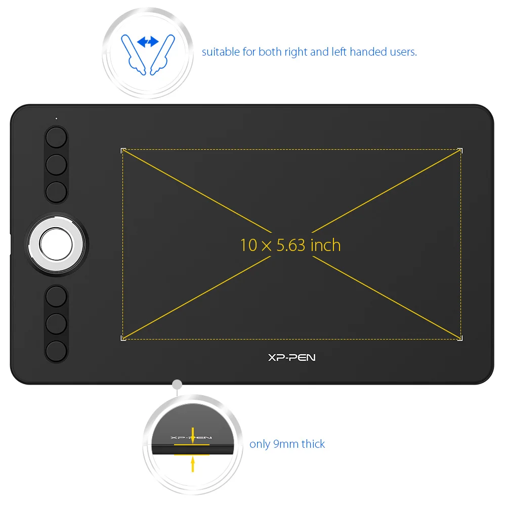 - Portable Design: Features a 10 x 5.63-inch working area for ample space to draw and create comfortably. Includes six customizable shortcut keys for a highly ergonomic and convenient work platform, enhancing efficiency. The tablet’s slim 9mm profile ensures easy portability.