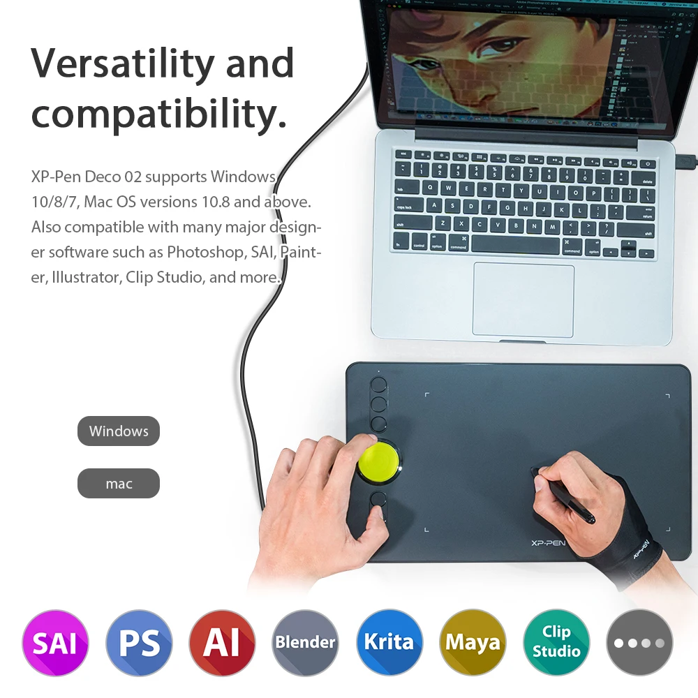 - Versatility and Compatibility: Supports Windows 10/8/7, Mac OS 10.10 and above, and is compatible with major designer software such as Photoshop, SAI, Painter, Illustrator, Clip Studio, and more. Compatibility is continually updated through driver improvements. Suitable for drawing, image editing, sketching, handwriting recognition, online education, and other applications.