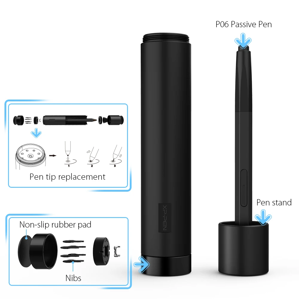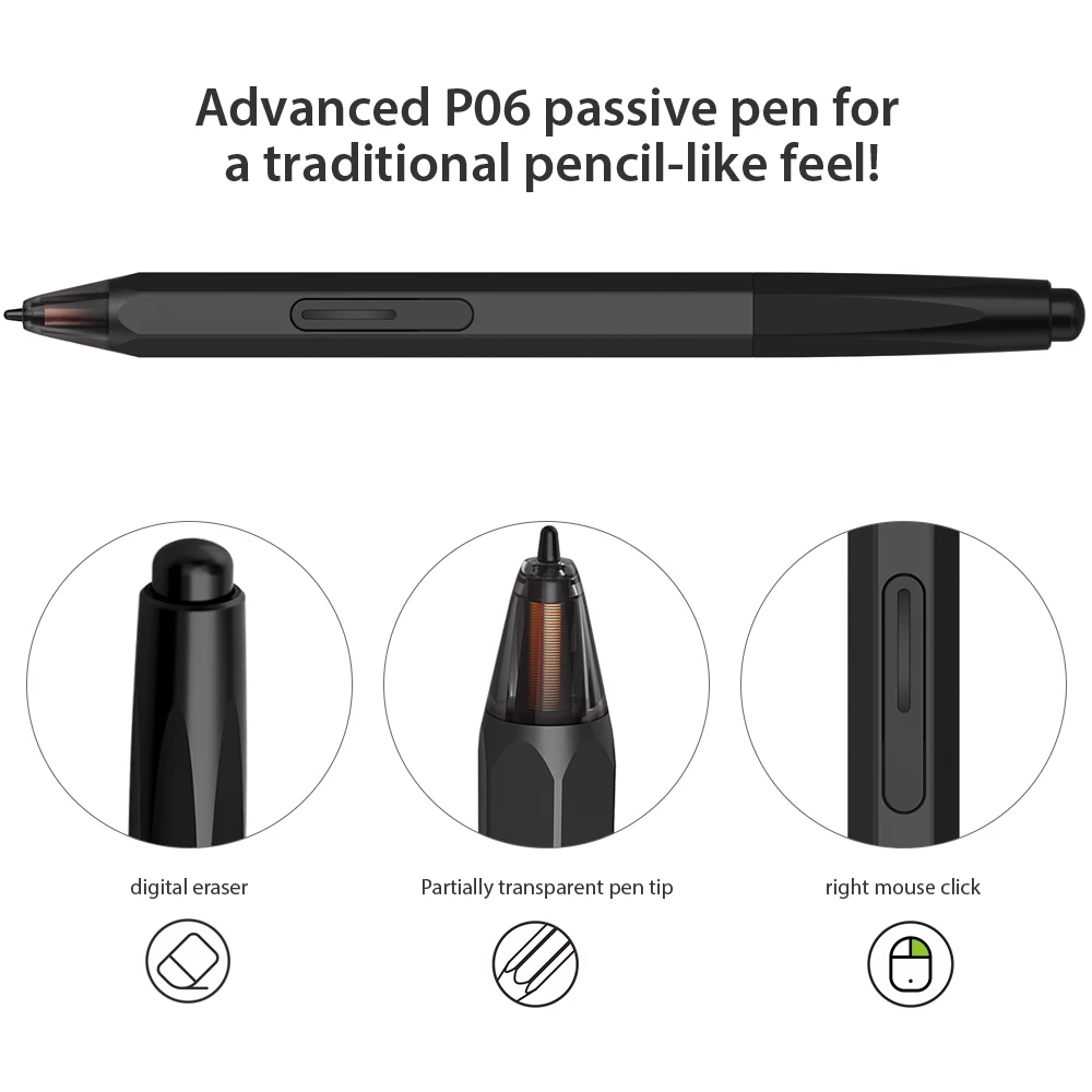 - Advanced P06 Passive Pen: Comes with a multi-function pen holder for safety and convenience. The battery-free P06 stylus pen is designed with a unique hexagonal shape, a non-slip, tack-free flexible grip, a partially transparent pen tip, and a digital eraser, offering a technical, efficient, fashionable, and comfortable grip.