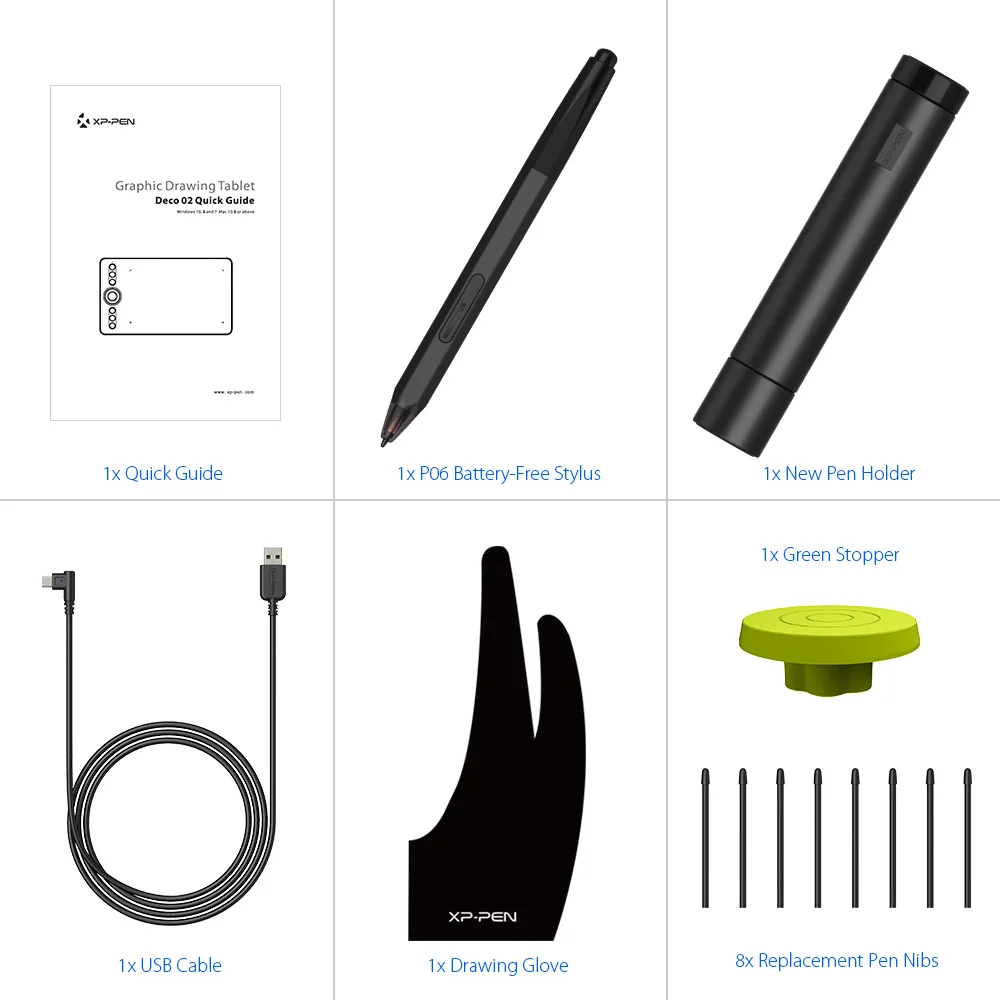 - Package Contents: Deco 02 Tablet, P06 Battery-Free Stylus, New Pen Holder, 8 Replacement Pen Nibs, TYPE-C USB Cable, Green Stopper, Drawing Glove, Quick Guide.