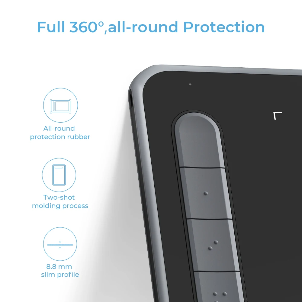 A two-shot molding process was adopted to construct the pen tablet. The rubber material around the edges, combined with a wear-resistant and shockproof design, provides all-around protection against accidental damage.