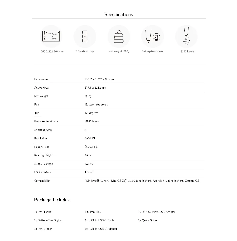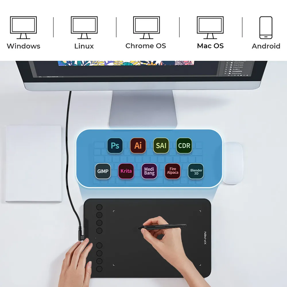 - Works with major software like Photoshop®, SAI®, Painter®, Illustrator®, Clip Studio®, GIMP®, Medibang®, Krita®, Fire Alpaca®, Blender® 3D, etc.