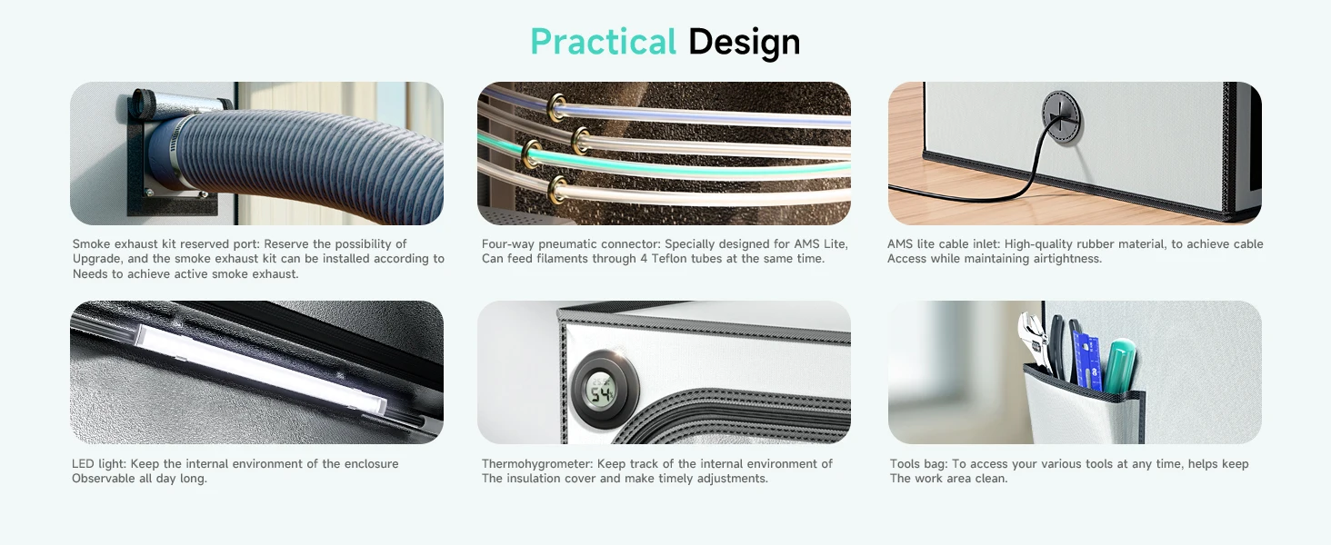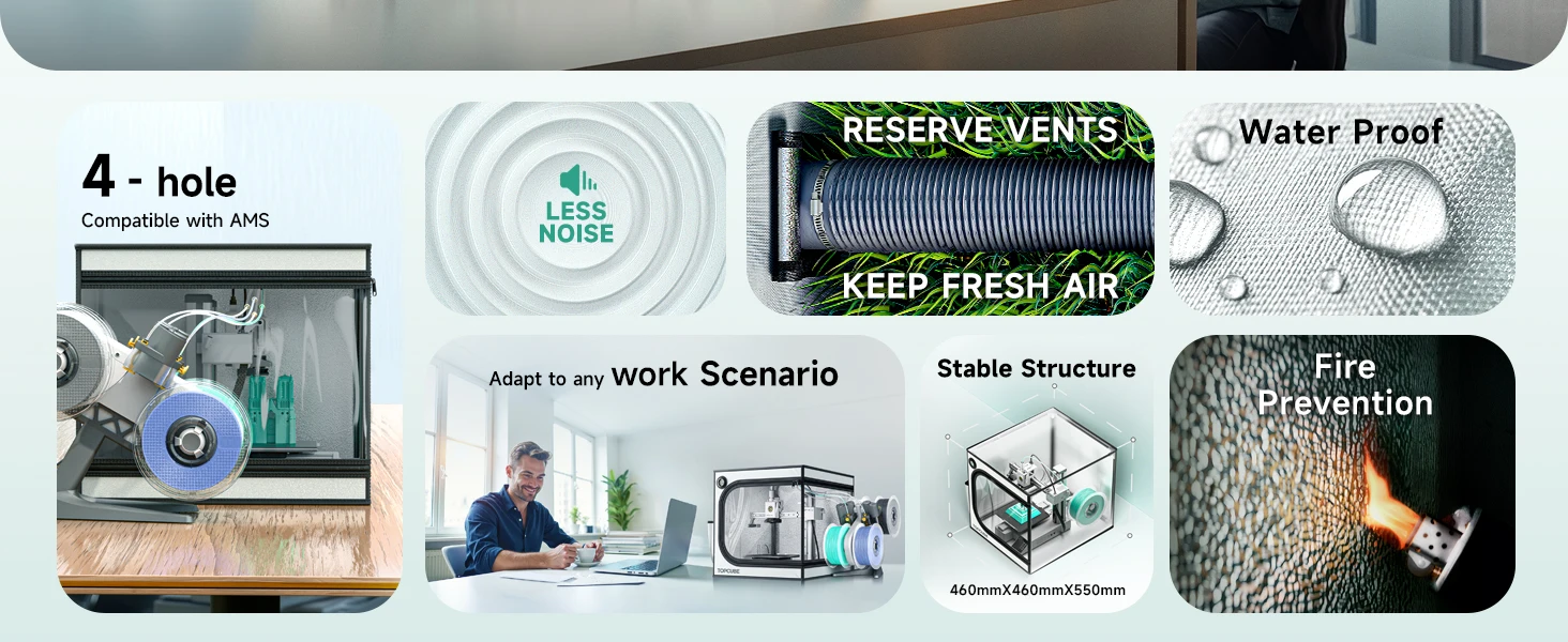 - Practical & Easy to Install Design: The TOPCUBE Enclosure is “Super Easy to Install and Use,” featuring a simple, quick frame assembly. It boasts a “Practical Design” with a reserved port for future smoke exhaust kit upgrades, a built-in thermohygrometer to monitor internal conditions, and a convenient tools bag to keep your workspace organized.