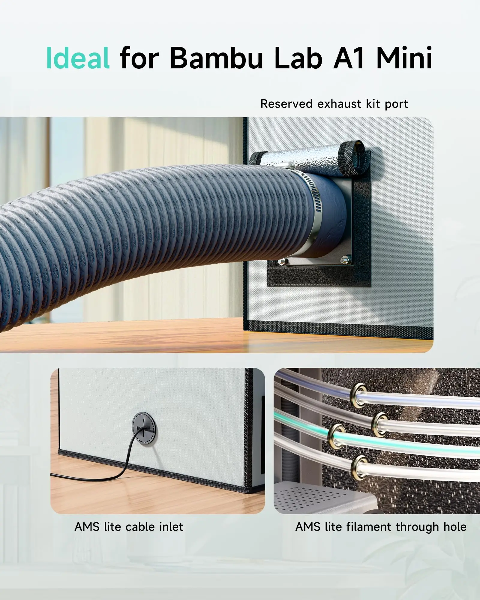 - Dedicated Bambu Lab A1 Mini & AMS Lite Compatibility: Engineered with precision for your A1 Mini, this enclosure features a specialized 4-hole pneumatic connector and an AMS Lite cable inlet. This ensures perfect integration and optimal filament feeding for up to four Teflon tubes simultaneously, perfectly accommodating your multi-color printing setup.