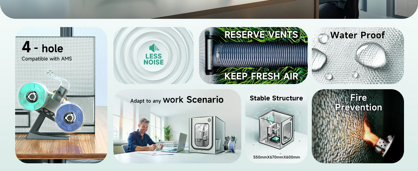 Dustproof and Fireproof Safety Measures: Safeguard your 3D printer with fire-resistant materials and a robust structure to prevent accidents. The enclosure effectively prevents dust particles from compromising print quality and protects against accidental contact from children or pets.