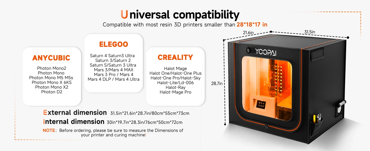 With external dimensions of 31.5″x21.6″x28.7″ (80cm x 55cm x 73cm), the YCOPAI Premium Resin 3D Printer Enclosure is an indispensable upgrade for any resin printing enthusiast seeking a professional, safe, and highly efficient workstation. Unlock superior performance and enjoy a cleaner, quieter printing environment today!