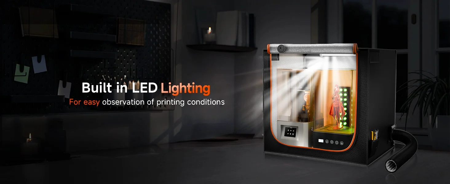 - Enhanced Visibility & User-Friendly Design: Monitor your prints with ease thanks to the large transparent window combined with bright built-in LED lighting. The enclosure features a stable structure that’s “Easy to Assemble,” adapting seamlessly to any work scenario.