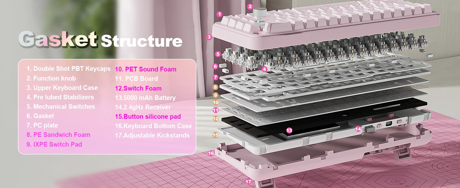 A precision gasket structure and five layers of sound-dampening materials (PE sandwich foam, IXPE switch pad, PET sound foam, switch foam, and a silicone button pad) reduce noise and vibration. Paired with the pre-lubed switches, the typing feel is soft and fluid.