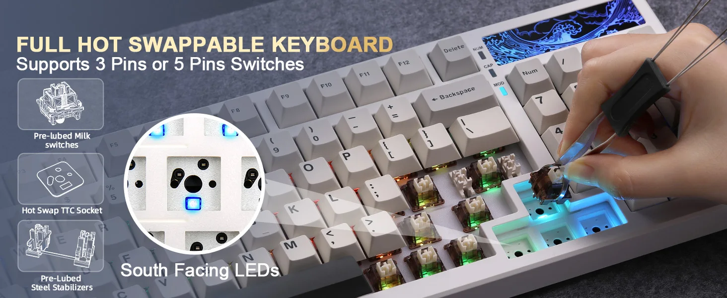 - Hot-swappable for 3-pin or 5-pin MX-style switches, soldering required.