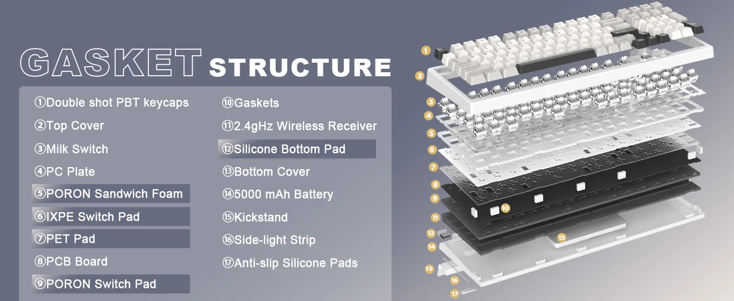 - Hi-fi sound treatment: IXPE pads, PORON foam, silicone pads, pre-lubed switches, and stabilizers for a solid, fatigue-free feel.