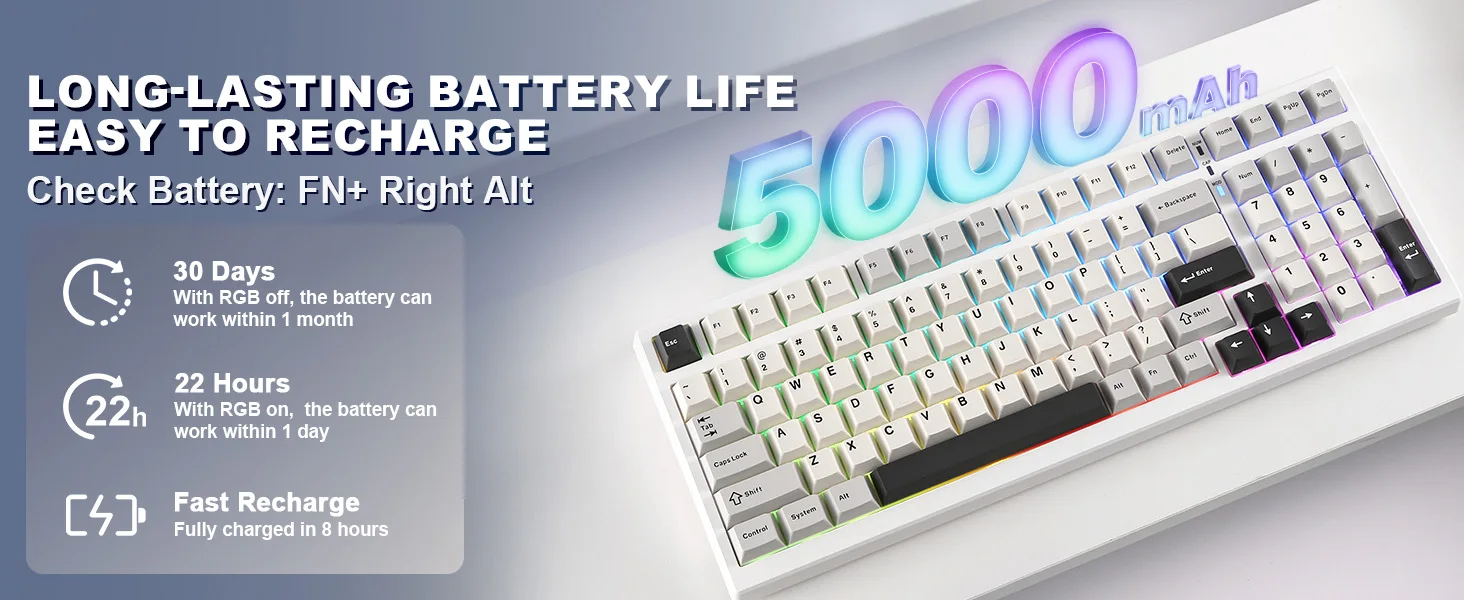 - Check battery level anytime with Fn + Right Alt.