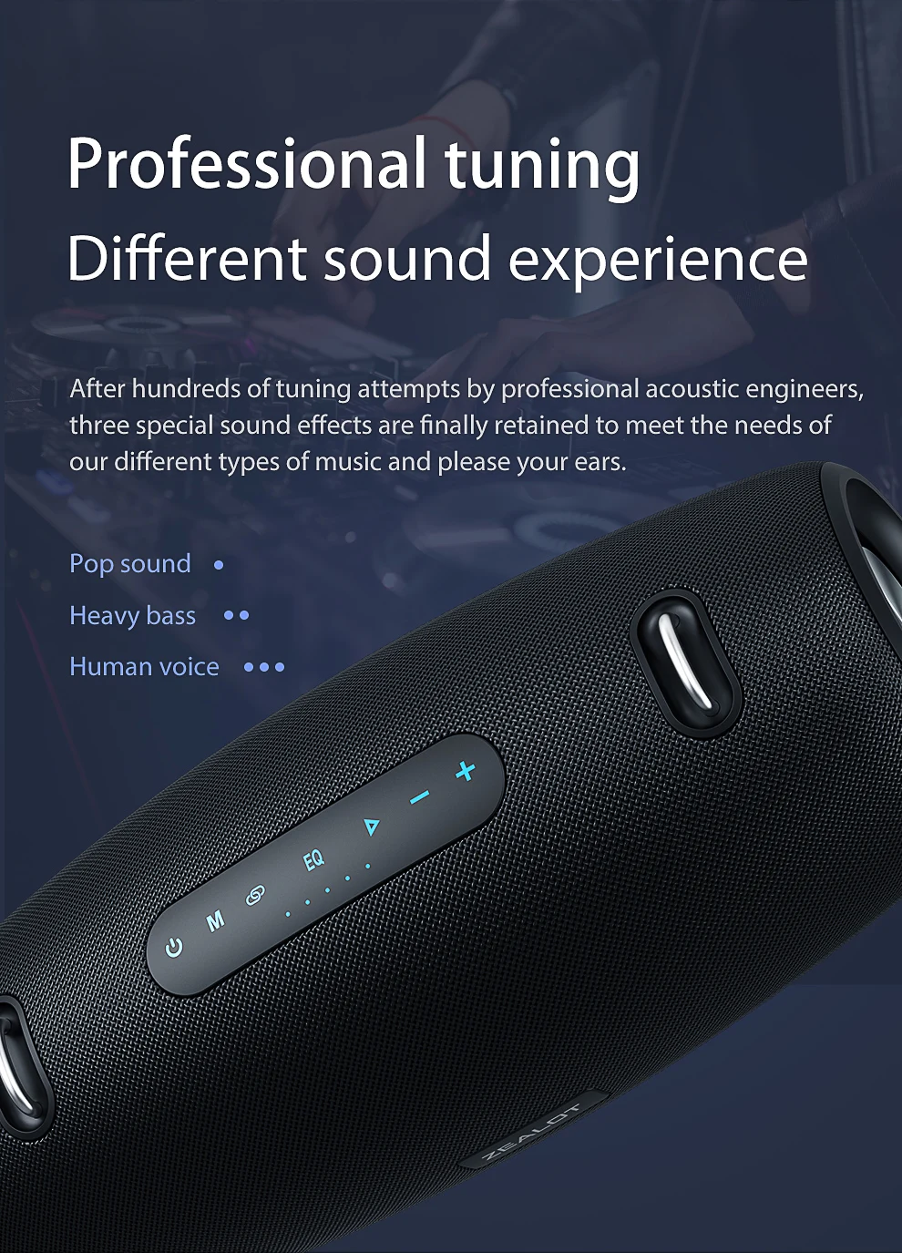 - Professionally Tuned with Customizable EQ Modes: Fine-tune your listening experience to perfection. Our speaker benefits from hundreds of professional acoustic engineering adjustments, retaining three special sound effects: “Pop sound,” “Heavy bass,” and “Human voice,” allowing you to optimize audio for different music genres and vocal clarity.